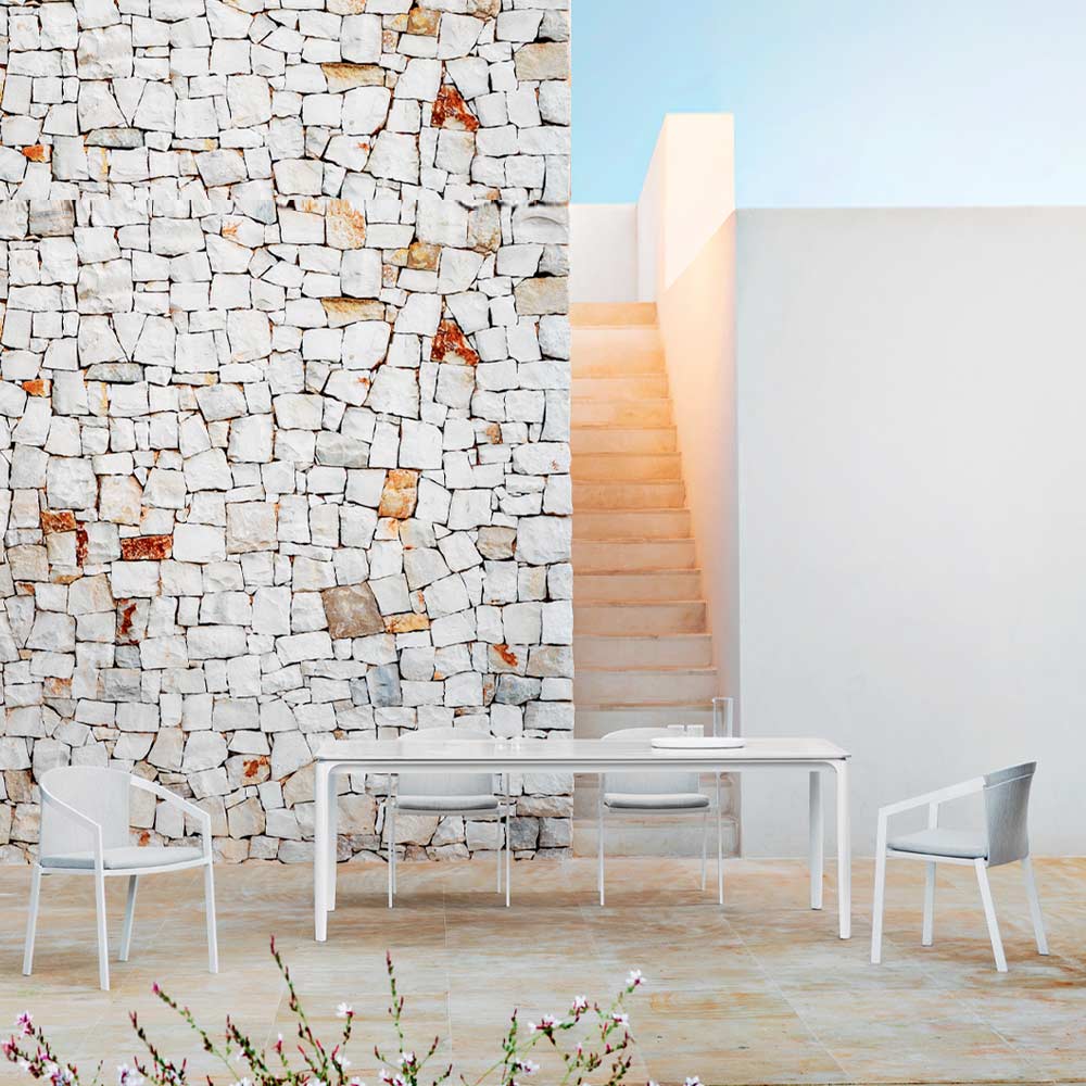 La colección se caracteriza por el detalle de la pata de aluminio como punto focal combinado con el rigor formal y modular del acolchado, para experimentar el aire libre en términos de máxima relajación y convivencia, sentado en el sofá, alrededor de una mesa o tumbado en el cama solar. .