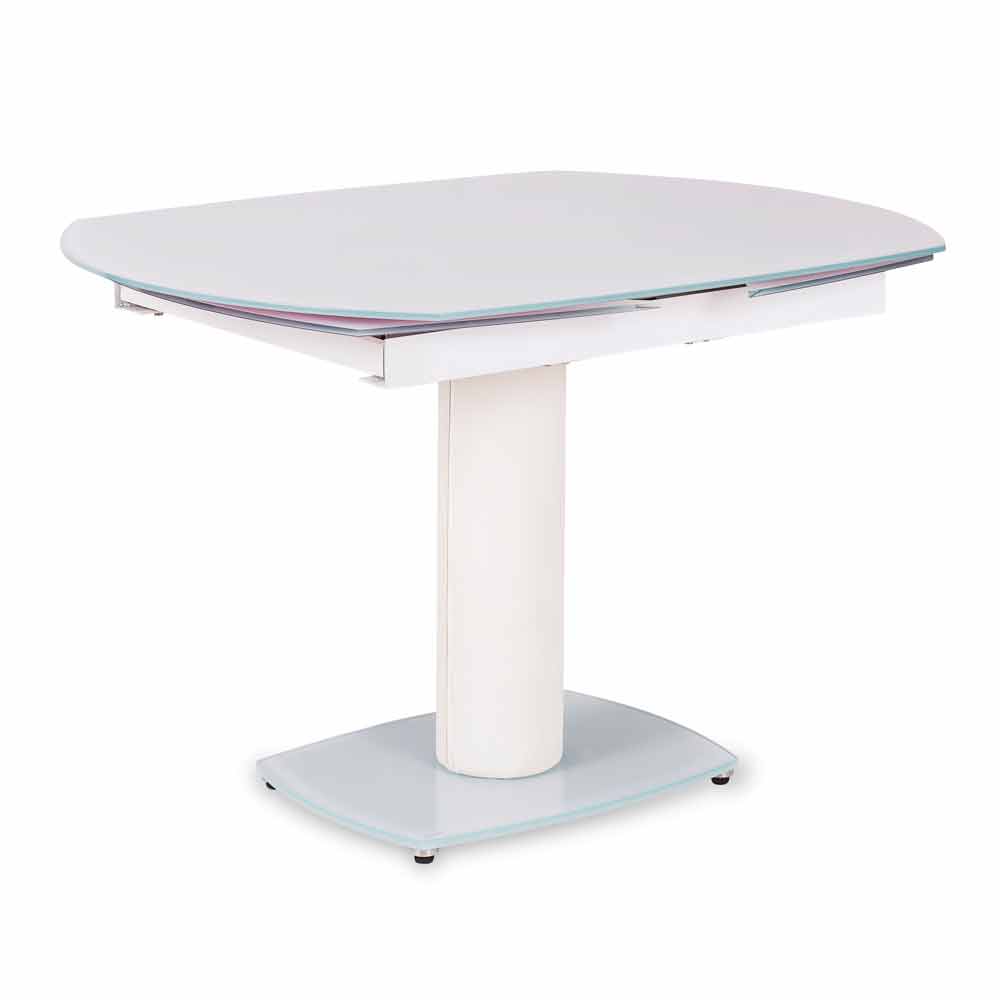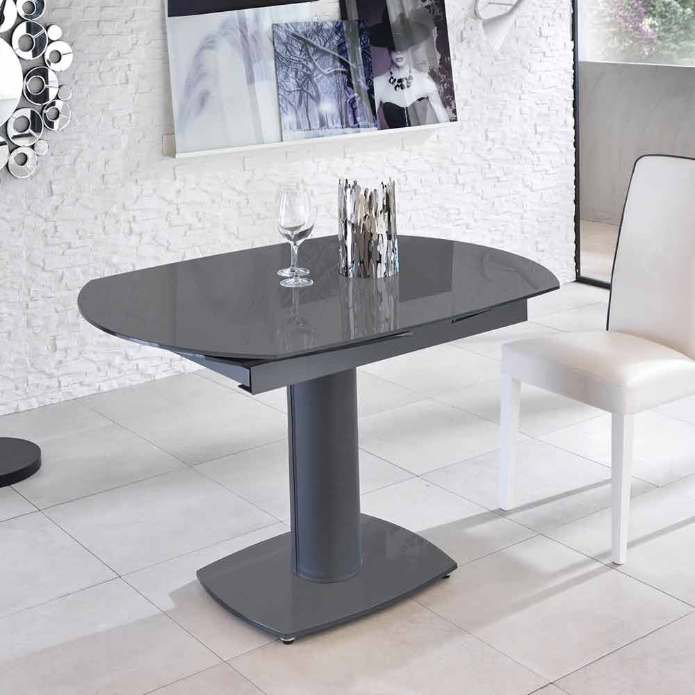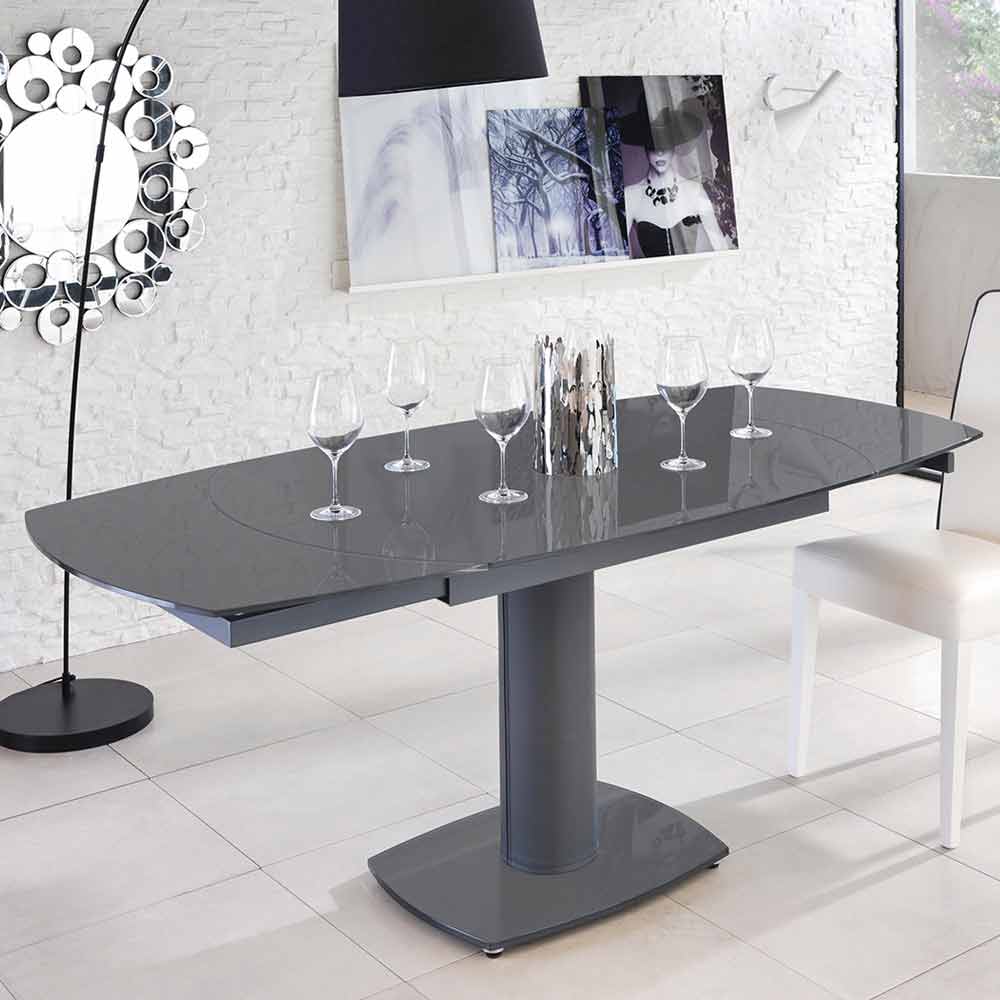 Leila es una mesa extensible de diseño moderno con base, tablero y extensiones en vidrio templado. Un rasgo distintivo de esta mesa es la columna de metal revestida en símil piel. Gracias a las prácticas extensiones es posible tener una superficie de 180 cm de largo.
