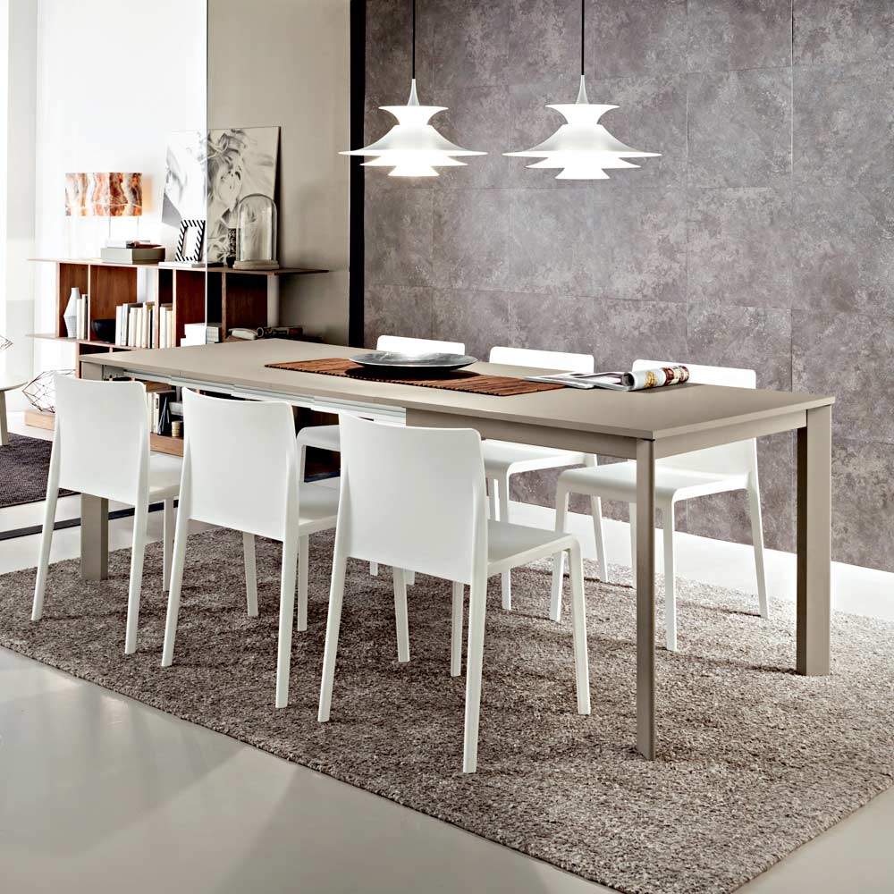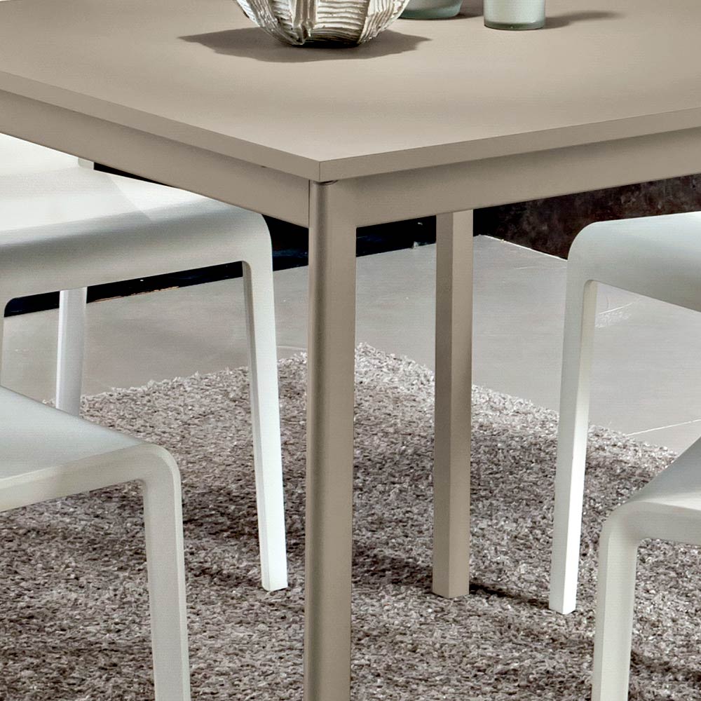 Mesa de comedor fabricada en Italia con tapa de fenix (espesor 20 mm), guía de aluminio sobre deslizadores de resina acetálica y base de aluminio lacado con polvos epoxi a juego con la tapa. Una solución moderna que basa su idea en el concepto de funcionalidad para ofrecer una mesa grande incluso a aquellos que disponen de pequeños espacios pero no quieren renunciar a acoger a amigos y familiares para pasar maravillosos momentos en compañía.