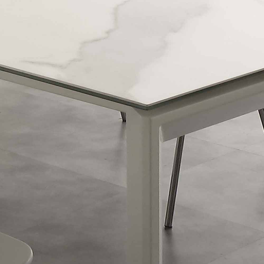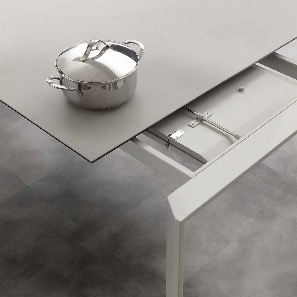 El tablero de la mesa es de vidrio y cerámica (3 + 8 cm), y está disponible en los acabados taupe fangoso, mármol blanco, gris cemento y gris antracita. El marco de la mesa hace juego con la tapa.