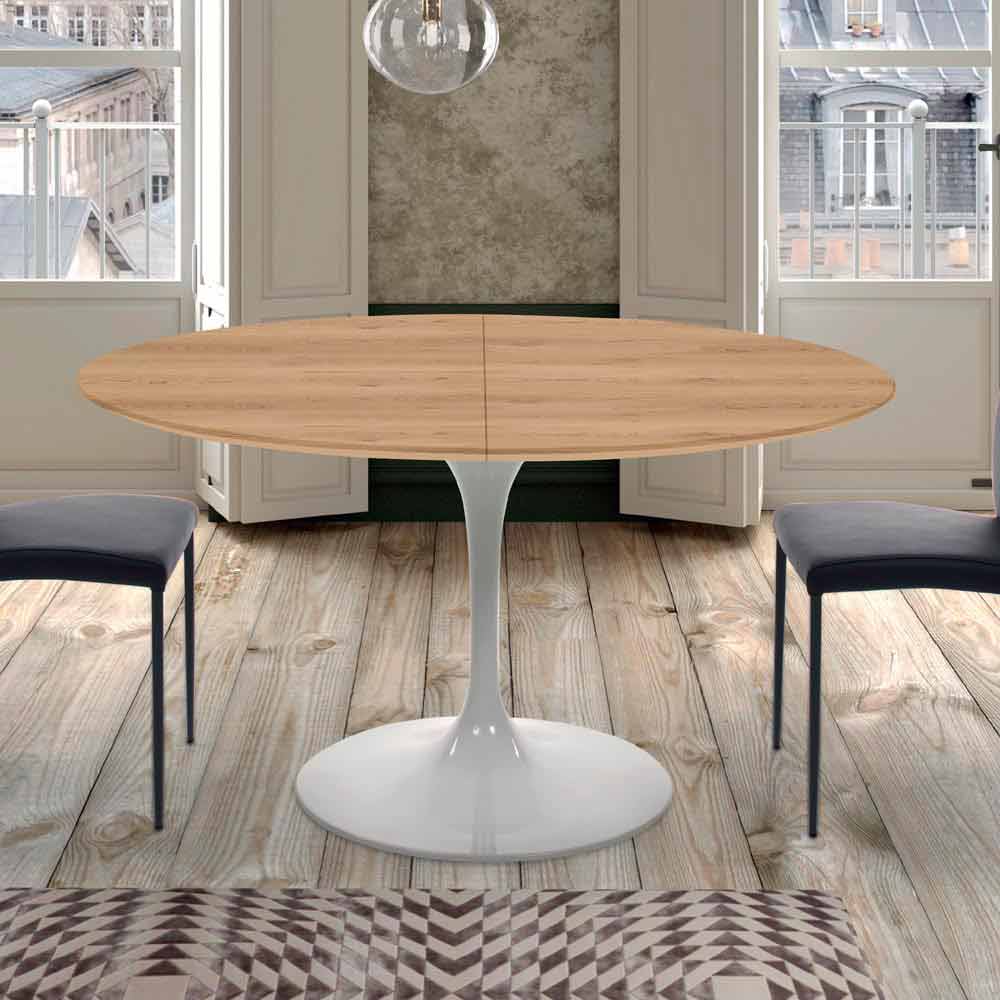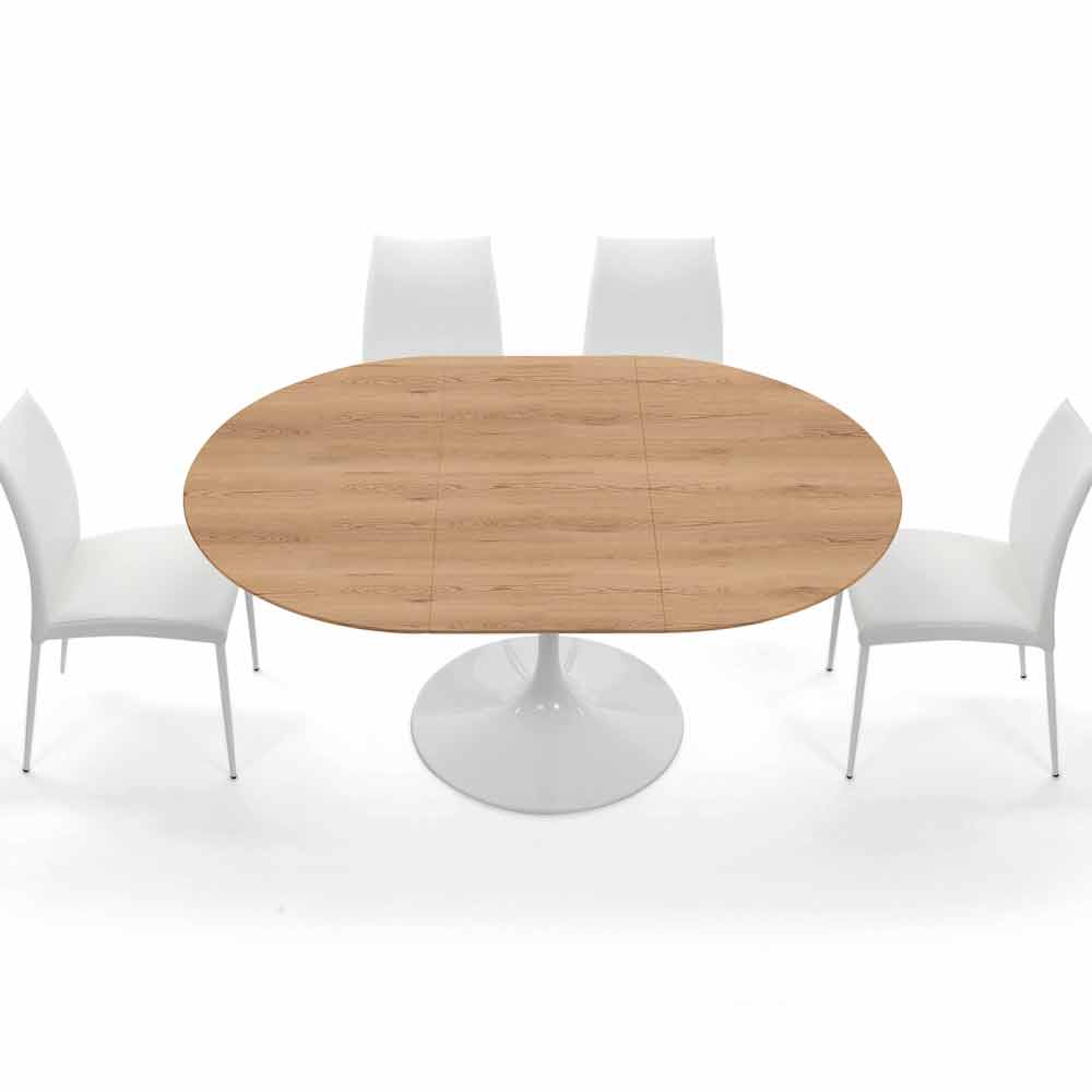 Elegante mesa de comedor fabricada en Italia con tapa redonda extensible en laminado HPL y base en fundición de aluminio lacado blanco brillo. Un diseño exclusivo y vanguardista caracteriza este complemento de decoración con un alma elegante y refinada capaz de decorar cualquier ambiente con un gusto moderno y con personalidad. Junto a la estética cautivadora y refinada, se subraya el lado funcional que aporta la tapa extensible que, gracias a una extensión exterior de 50 cm, ofrece la posibilidad de alojar hasta 8 personas, ocupando un espacio más reducido una vez cerrado. El toque que caracteriza la mesa, haciéndola única y dándole un diseño refinado , es el tablero de hpl, un laminado de alta presión extremadamente resistente a los agentes químicos, abrasiones y rayones que asegura una superficie de apoyo sólida con una excelente durabilidad en el tiempo .