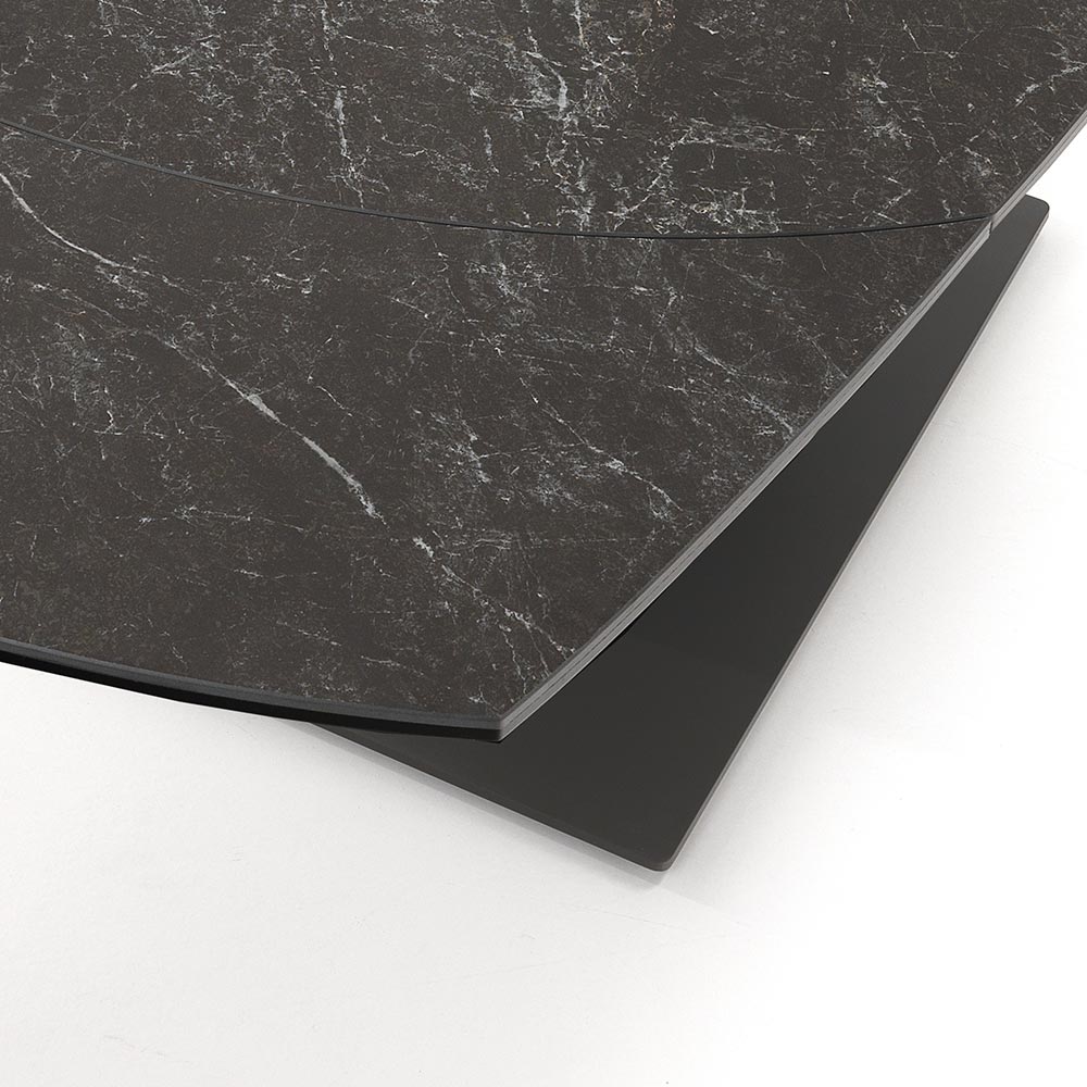 mecanismo giratorio , la mesa puede alcanzar una longitud máxima de 180 cm lo que le permite acomodar a un mayor número de invitados para maravillosos almuerzos y cenas con amigos. La perfecta combinación de la elegancia de la cerámica y el imponente detalle de la base de acero crea un mueble con una
