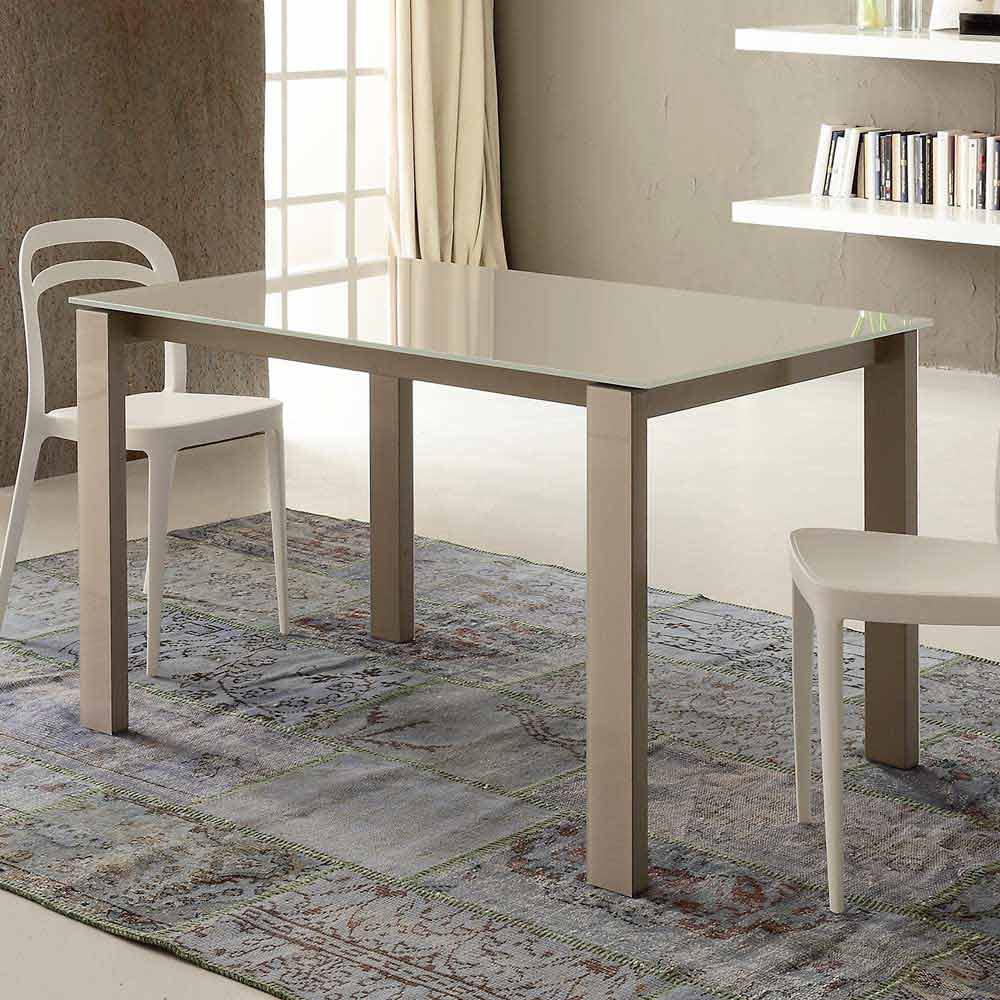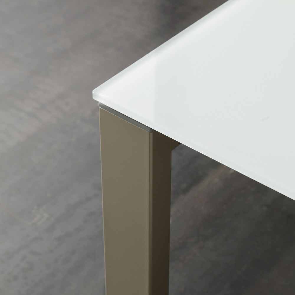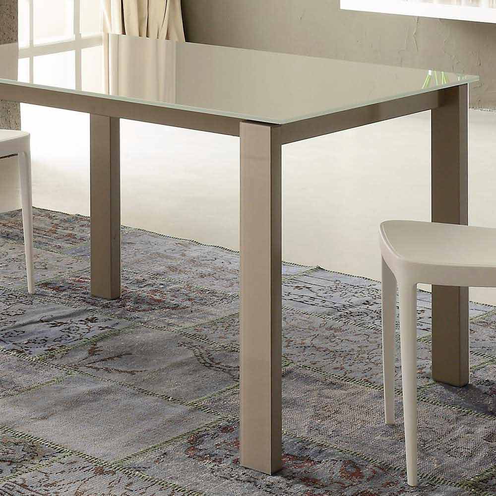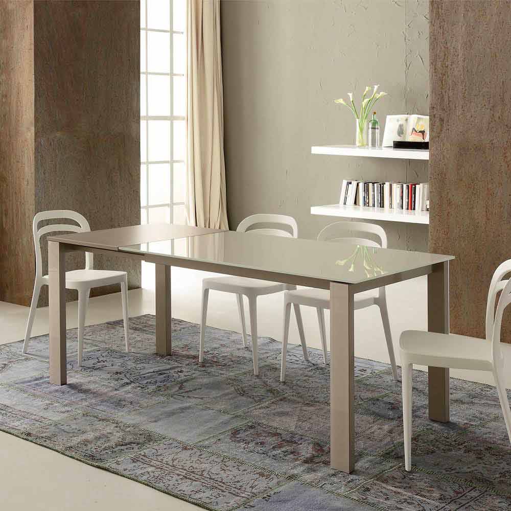 Mesa de comedor fabricada en Italia con tapa de cristal (10 mm de espesor), extensión de melamina acabado cáñamo y base de metal pintado acabado champán.