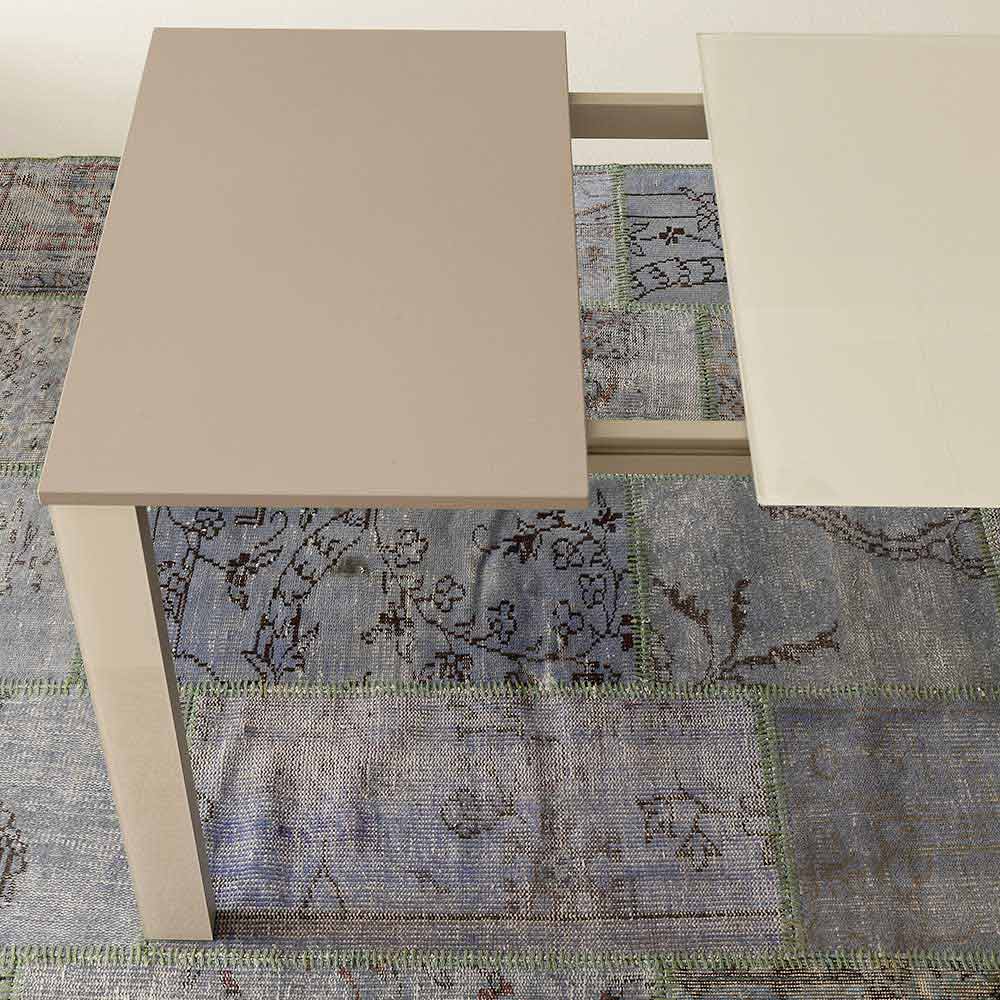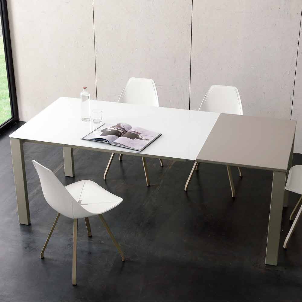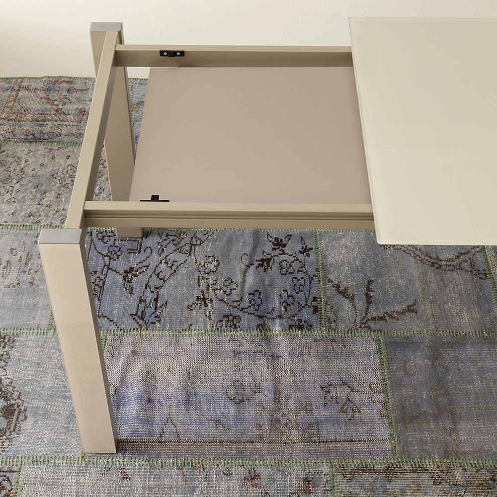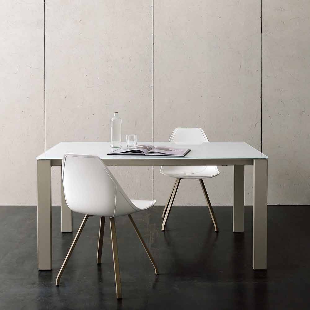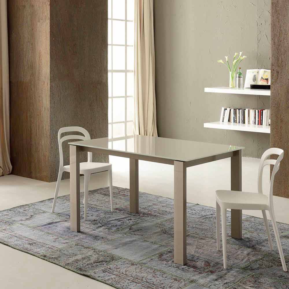 Mesa de comedor fabricada en Italia con tapa de cristal (10 mm de espesor), extensión de melamina acabado cáñamo y base de metal pintado acabado champán.