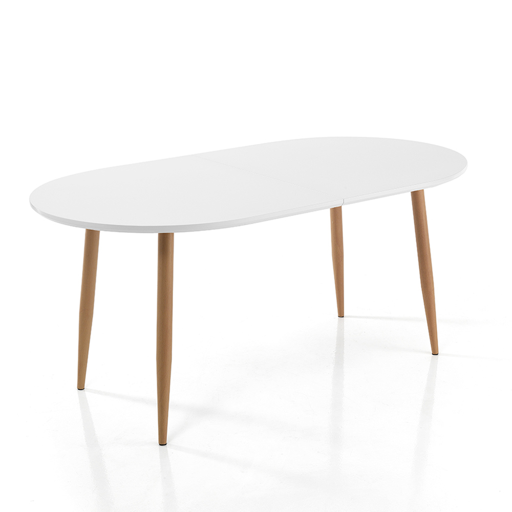 Mesa de comedor con tapa extensible ovalada fabricada en mdf blanco mate y patas en metal acabado roble . La encimera puede alcanzar una longitud de 190 o 220 cm gracias a dos extensiones externas de 30 cm cada una. Un producto con un estilo minimalista y alta versatilidad de uso diseñado para quienes prefieren un mobiliario sencillo pero impactante y para quienes aman organizar almuerzos y cenas en compañía y por tanto necesitan una superficie amplia para albergar a un mayor número de amigos y familiares.