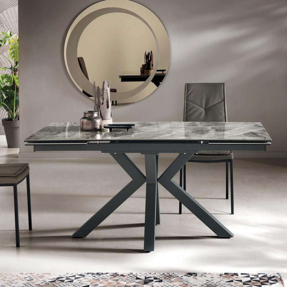 Mesa de comedor extensible con tapa de gres porcelánico efecto mármol y base de metal pintado de líneas sencillas y modernas, capaz de dar carácter a tu ambiente. Equipado con 2 extensiones laterales de 40 cm y un mecanismo de rotación que permite extender el tablero de forma rápida y sencilla para un resultado funcional y especialmente original .