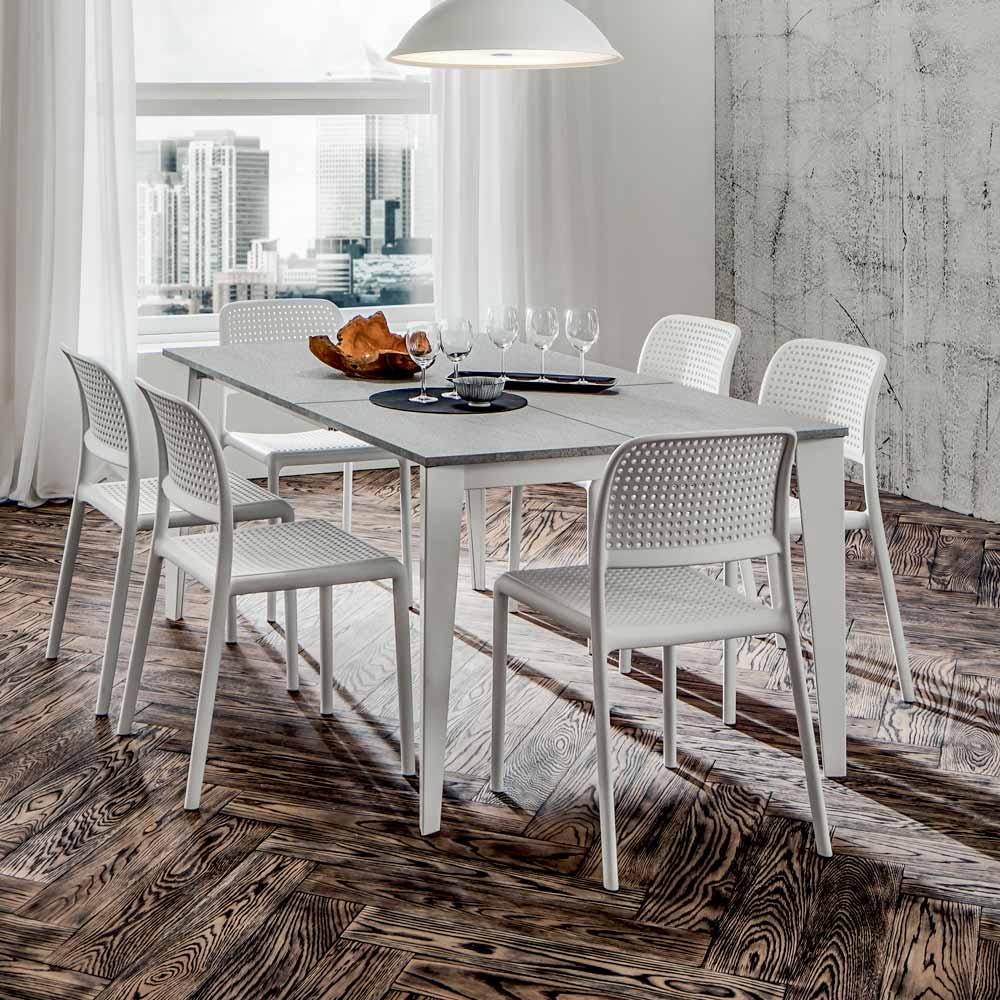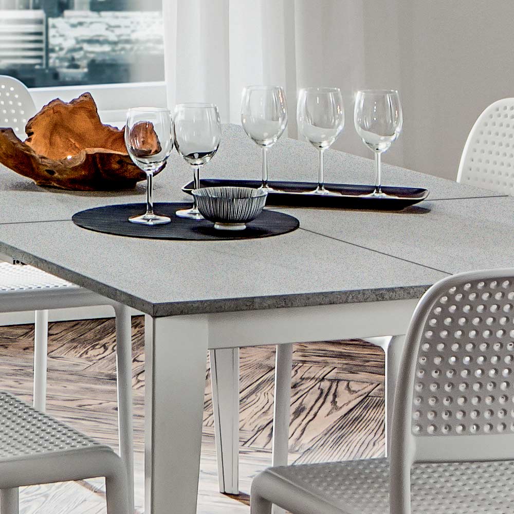 base de metal lacado con polvos epoxi, acabado blanco. Una mesa elegante y discreta con un pequeño tablero cuadrado que, si es necesario, se puede transformar para albergar hasta 10 personas, resultando una solución especialmente adecuada para quienes aman recibir invitados en casa para disfrutar de maravillosos almuerzos y cenas en compañía. Esta característica representa su verdadera peculiaridad ya que, gracias a
