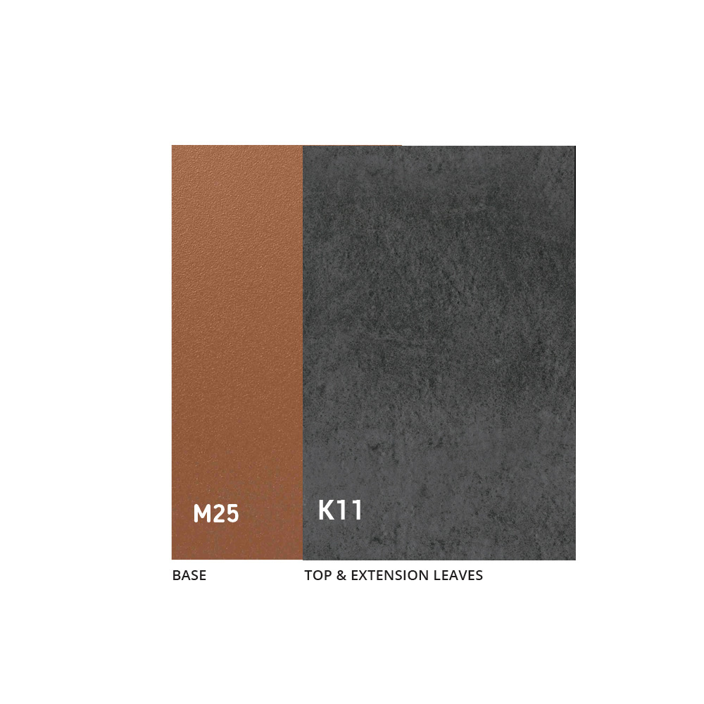 Mesa realizada con estructura de metal pintado gofrado cobre y tapa de cerámica de 3 mm.