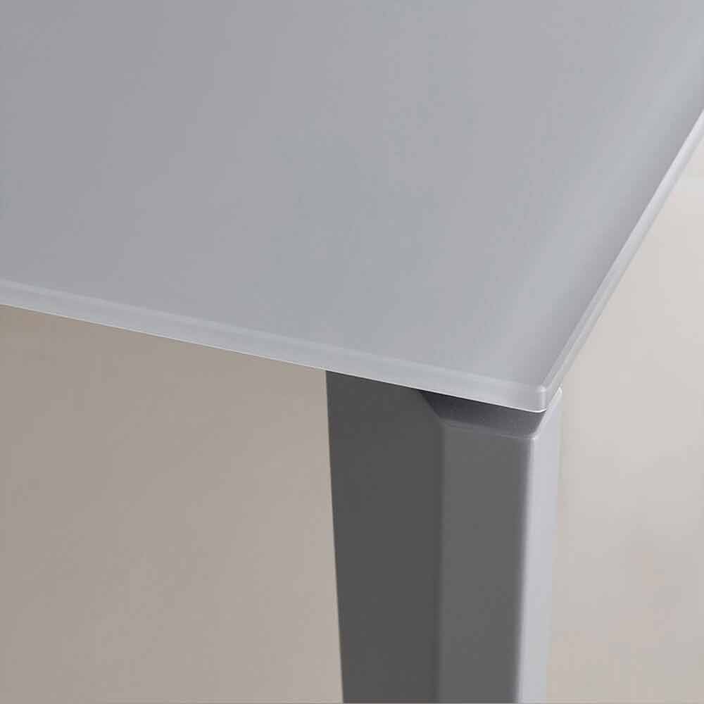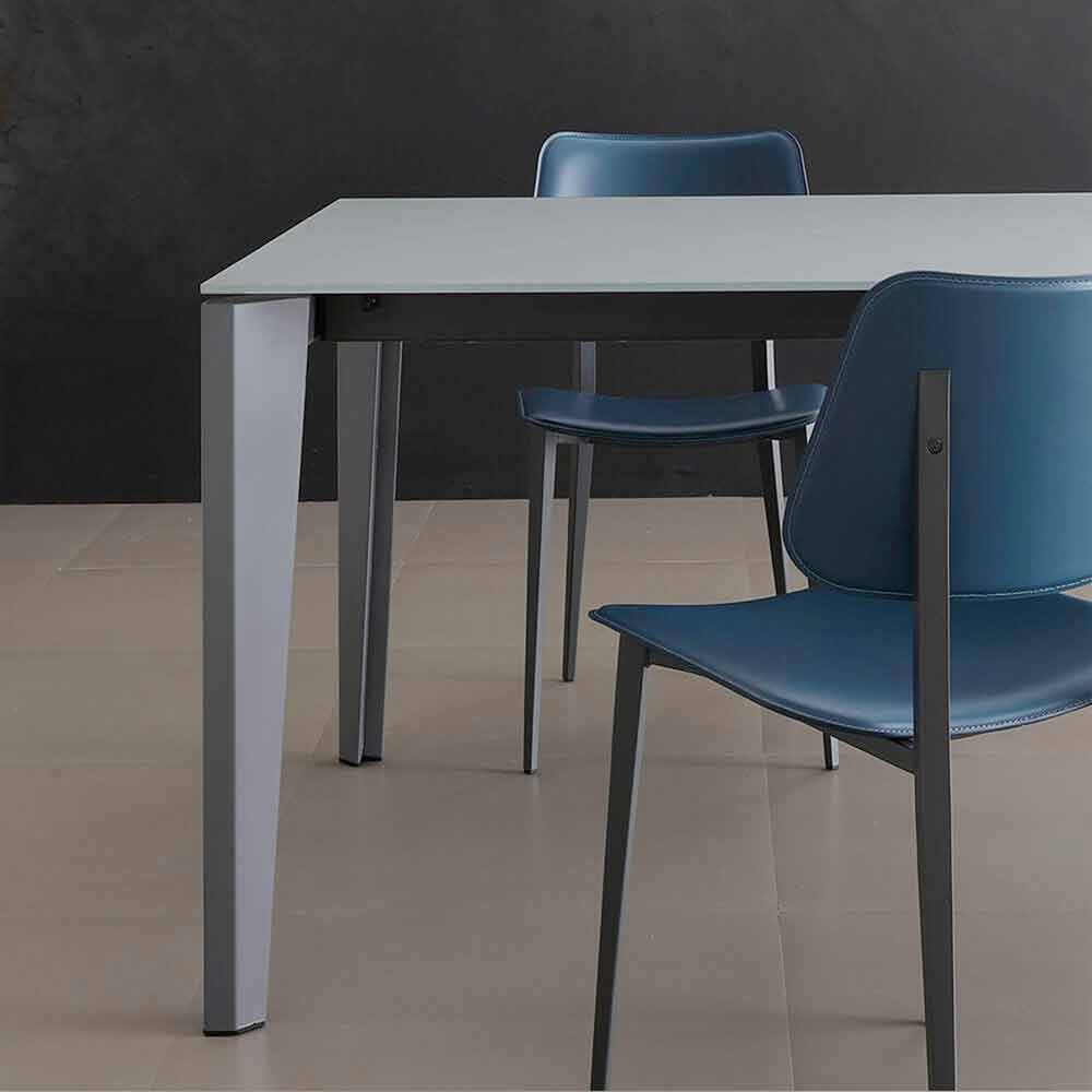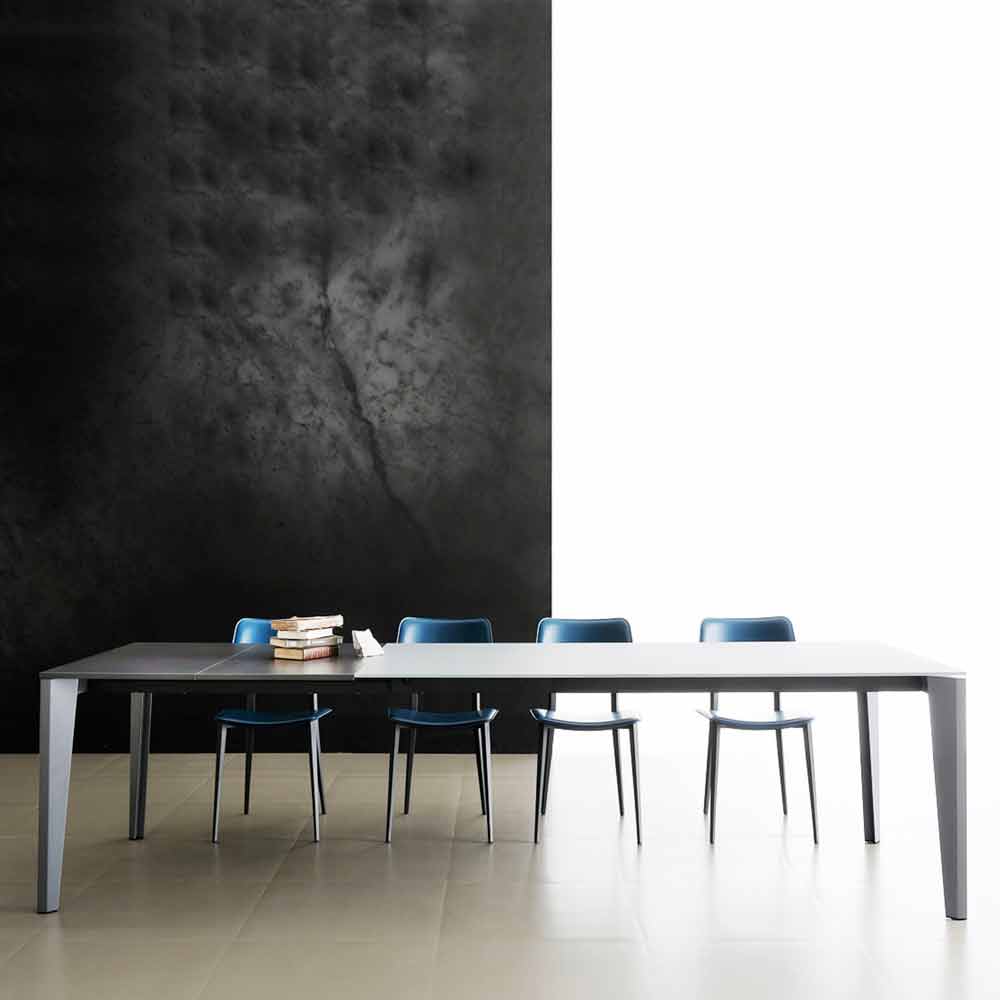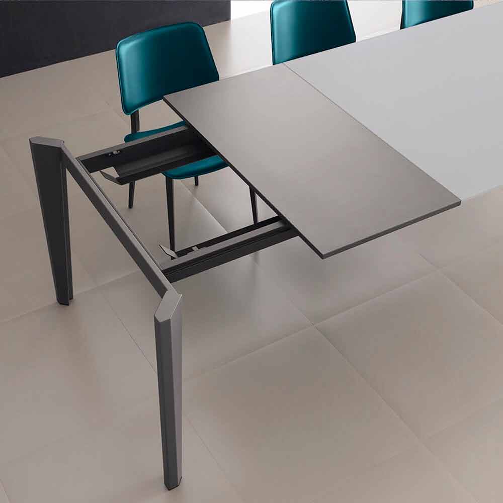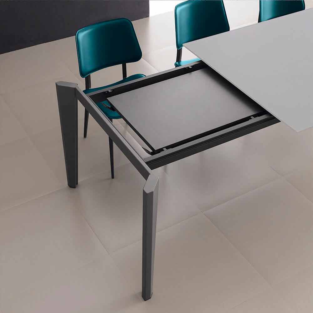 Mesa de comedor fabricada en Italia con tapa extensible en vidrio satinado antihuellas (10 mm de espesor) con acabado en polvo, extensión en melamina antracita y base en metal pintado antracita .