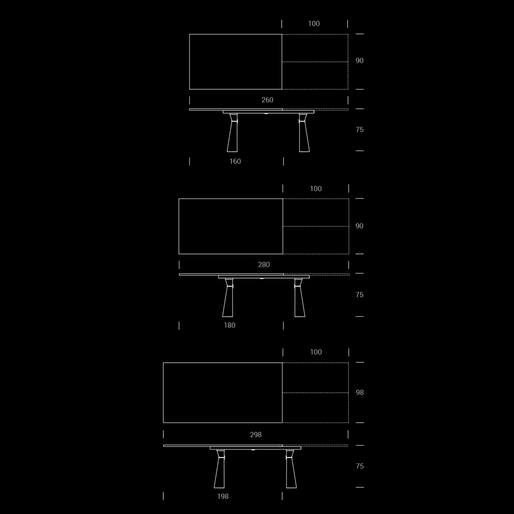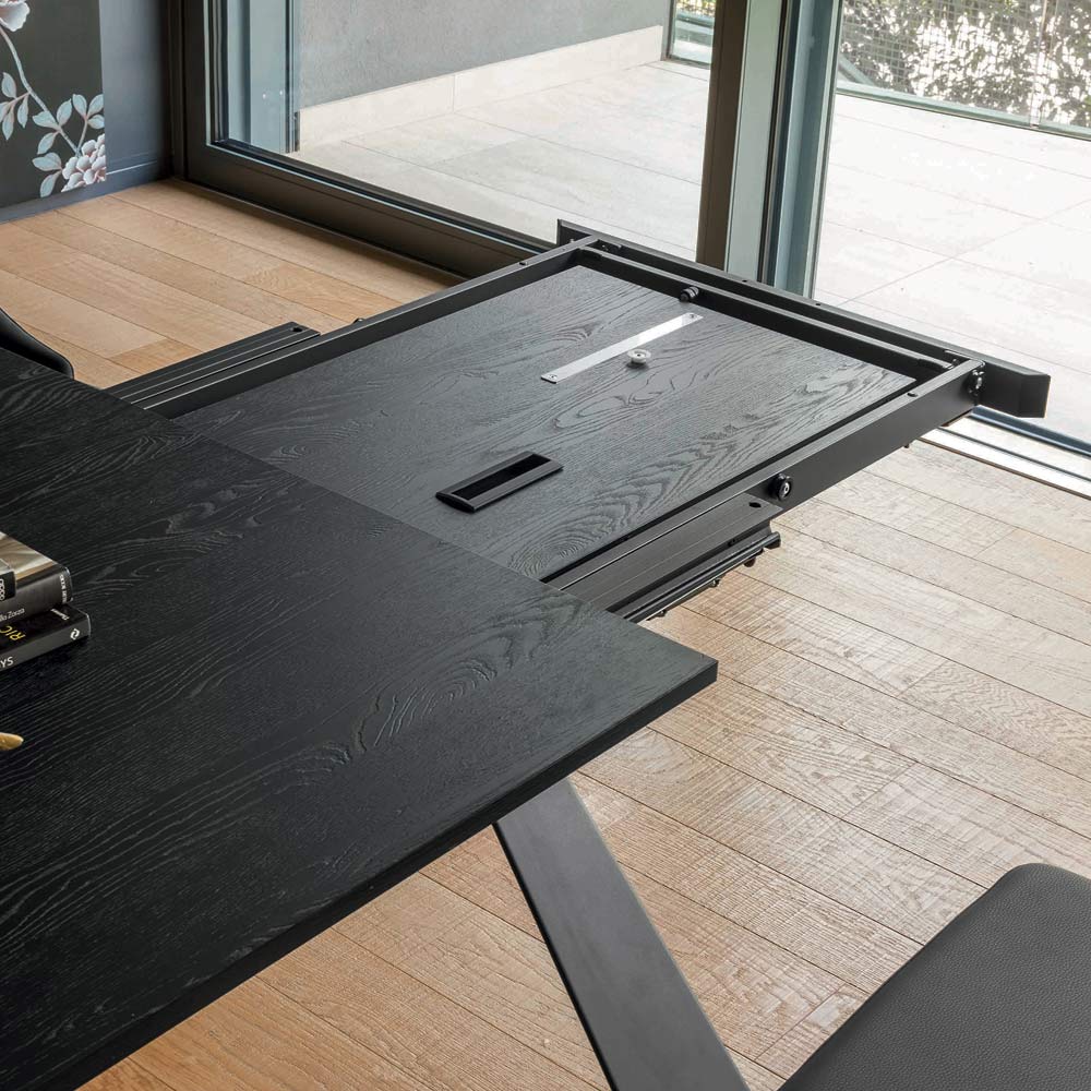 extensión interna abatible con apertura sincronizada, permite extender la tapa hasta una longitud máxima de 298 cm para acomodar así a un mayor número de personas en comidas y cenas. en compañía. Una vez cerrado, vuelve a ocupar el mínimo espacio ofreciendo la máxima funcionalidad junto a una