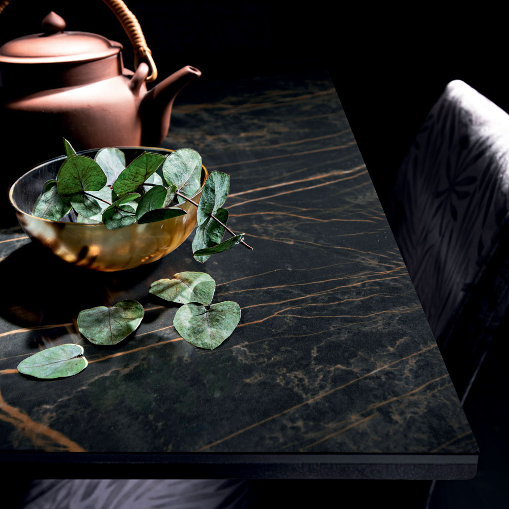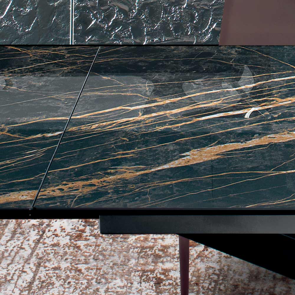 Mesa de comedor fabricada en Italia con tapa de cerámica laminada y estructura de acero pintado de negro . Un mueble elegante capaz de captar el centro de atención gracias a la espléndida combinación de materiales y la alta calidad ofrecida que asegura un producto de alto valor y particularmente resistente en el tiempo . De hecho, el laminam, además de completar con elegancia el aspecto de la mesa, es un material que presenta numerosas peculiaridades que lo convierten en una opción ideal para aportar al mismo tiempo una sólida superficie de apoyo y un diseño elegante capaz de revolucionar cualquier ambiente con personalidad.