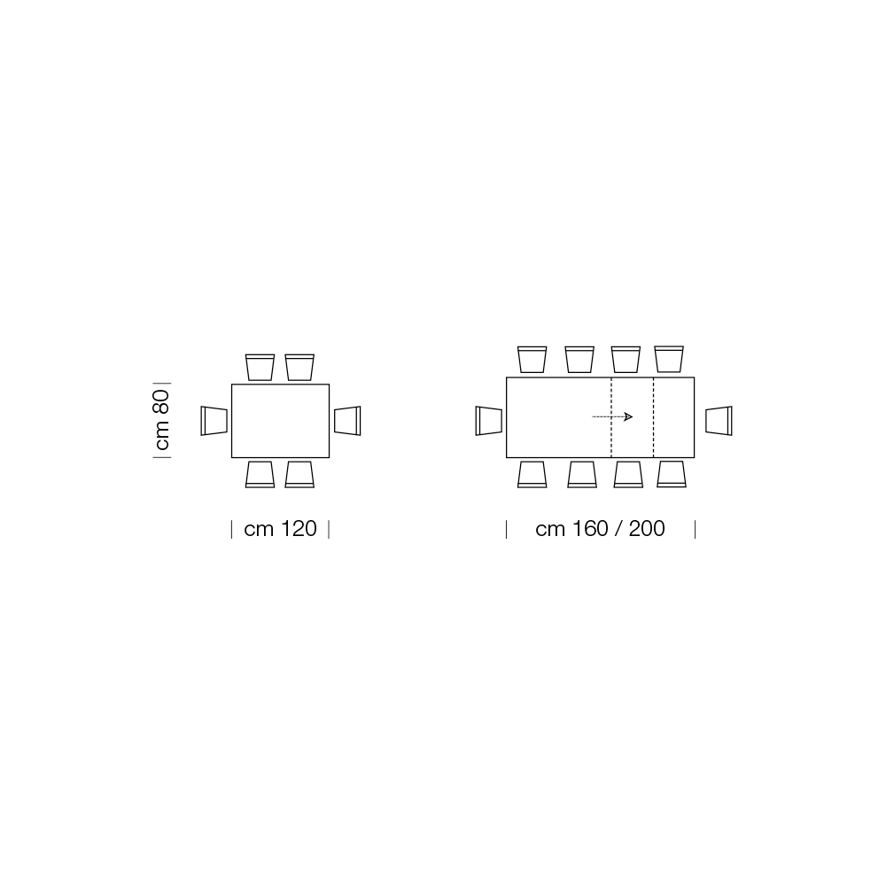 - L 120 (160) x P 80 x H 75 cm 8 asientos extensibles con una extensión interna de 40 cm;