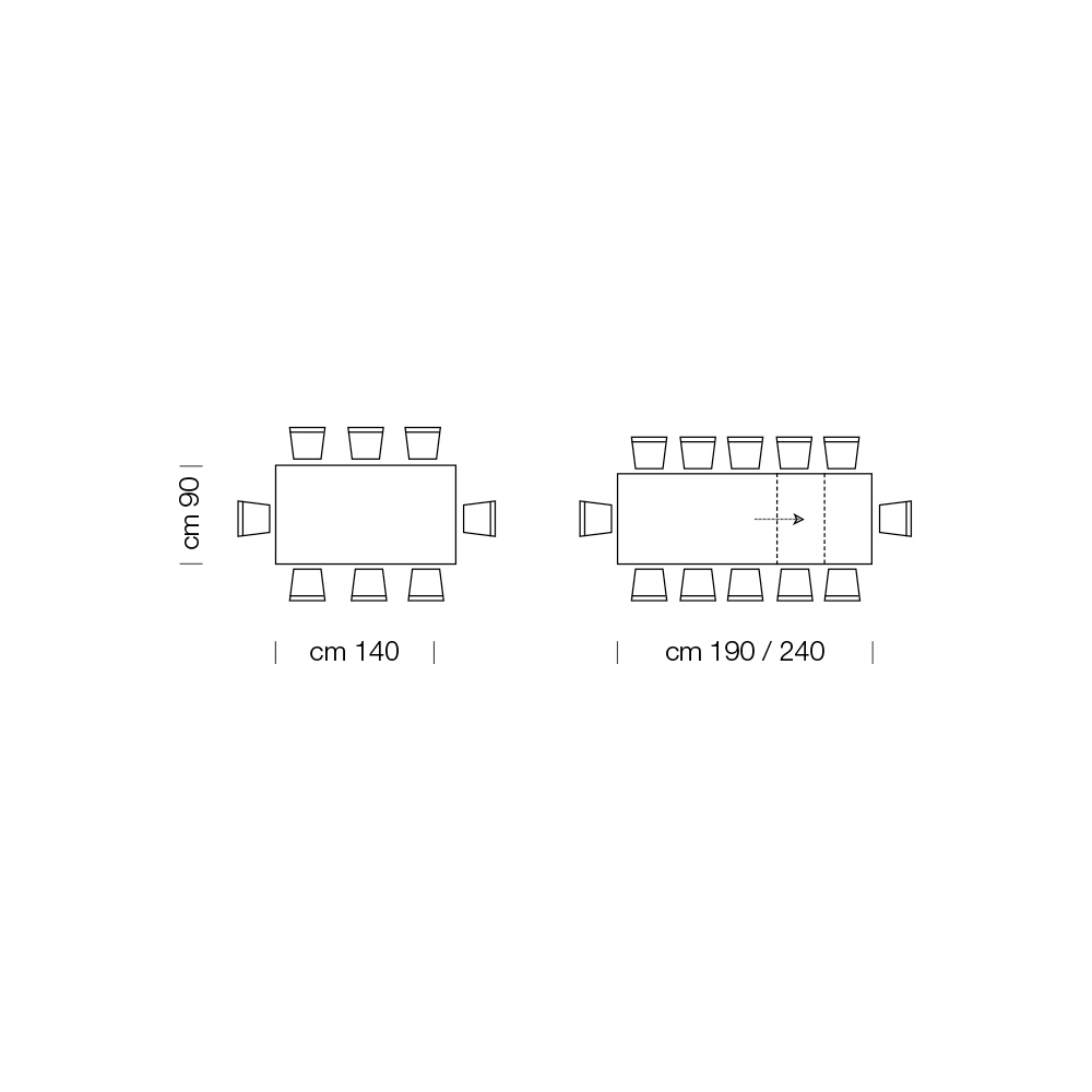- L 140 (240) x P 90 x H 75 cm 12 plazas extensible con dos extensiones internas de 50 cm cada una;