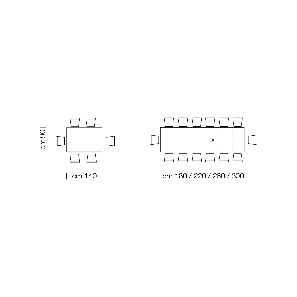 - L 140 (300) x P 90 x H 75 cm 14 plazas extensible con cuatro extensiones internas de 40 cm cada una;