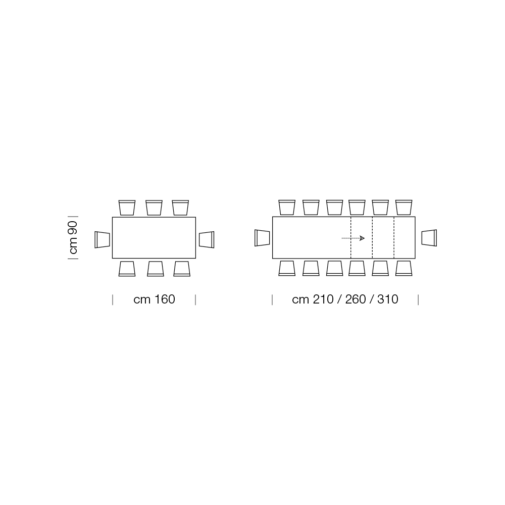 - L 160 (310) x P 90 x H 75 cm 14 plazas extensible con tres extensiones internas de 50 cm cada una.