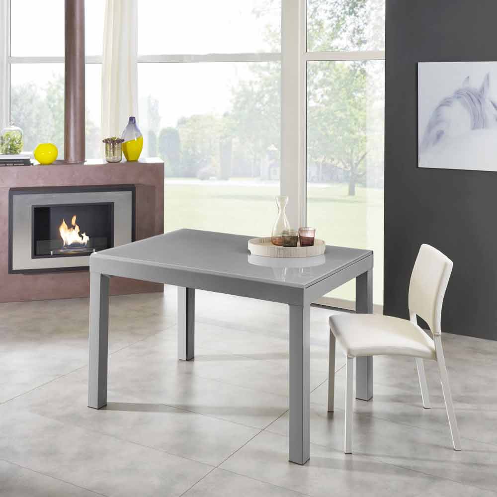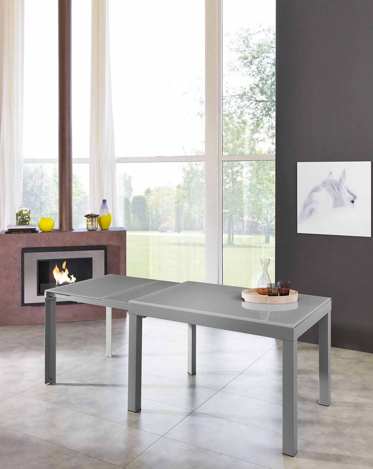La mesa está realizada con una estructura de metal pintado de color gris y tapa de vidrio templado y melamina del mismo color, así como las extensiones internas, también en vidrio templado gris.