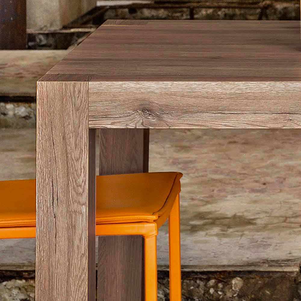 La mesa de comedor Oky está fabricada en melamina con acabado en roble natural. Dispone de 4 prácticas extensiones de 40 cm cada una que permiten extender la mesa hasta una superficie de 320 cm, mediante un práctico y rápido sistema de extensión sobre carriles deslizantes.