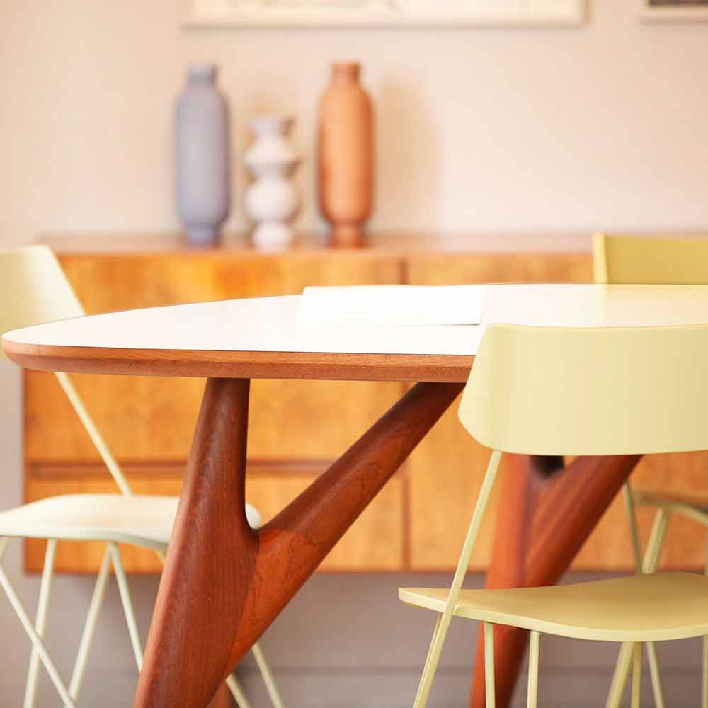 Mesa de comedor moderna y original totalmente hecha a mano en Italia con tablero laminado HPL y estructura de madera maciza de caoba.