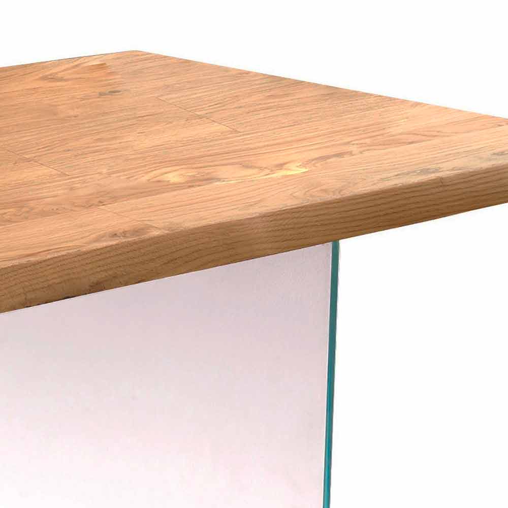 La mesa Nico se caracteriza por un diseño que juega con el contraste entre diferentes materiales como la madera y el vidrio. De hecho, la base está hecha de vidrio templado extra claro de 12 mm, mientras que la tapa es de chapa de roble en bruto con borde macizo y descortezado.