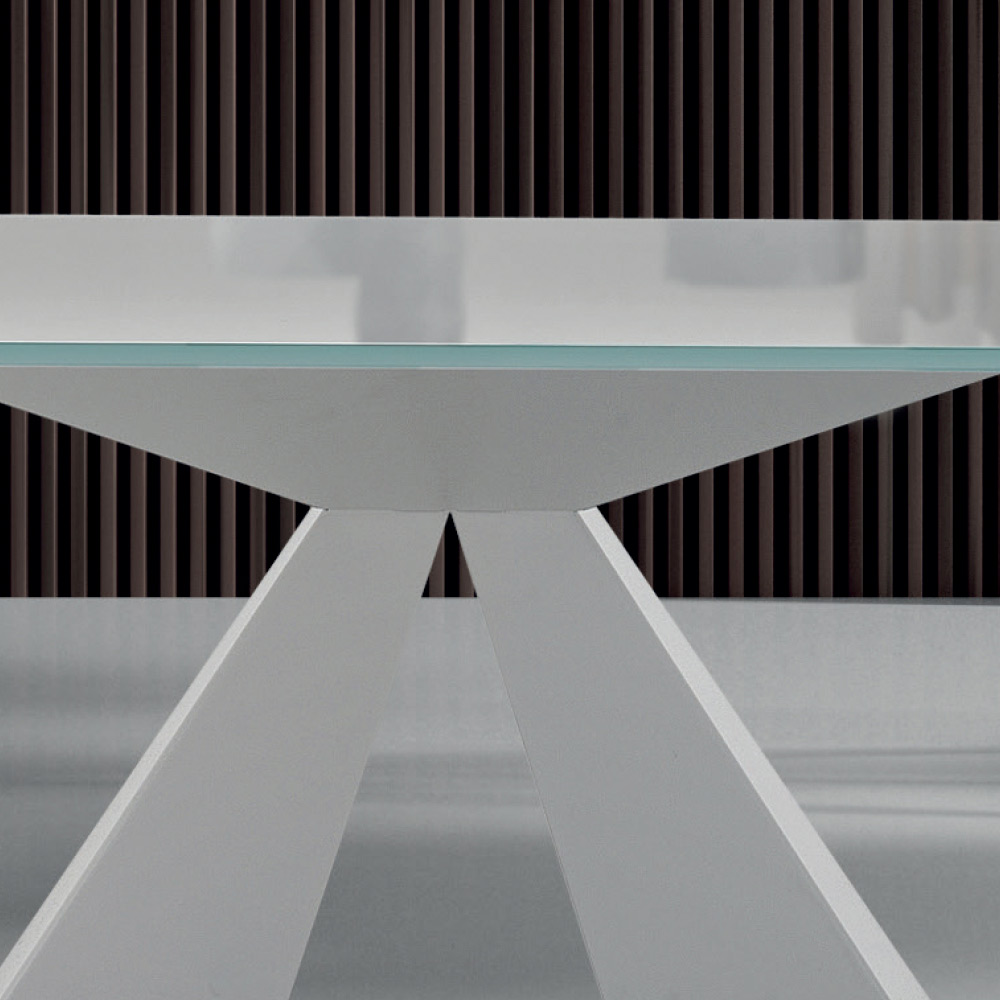 Mesa rectangular moderna, elaborada artesanalmente en Italia con vidrio templado y base de acero blanco.