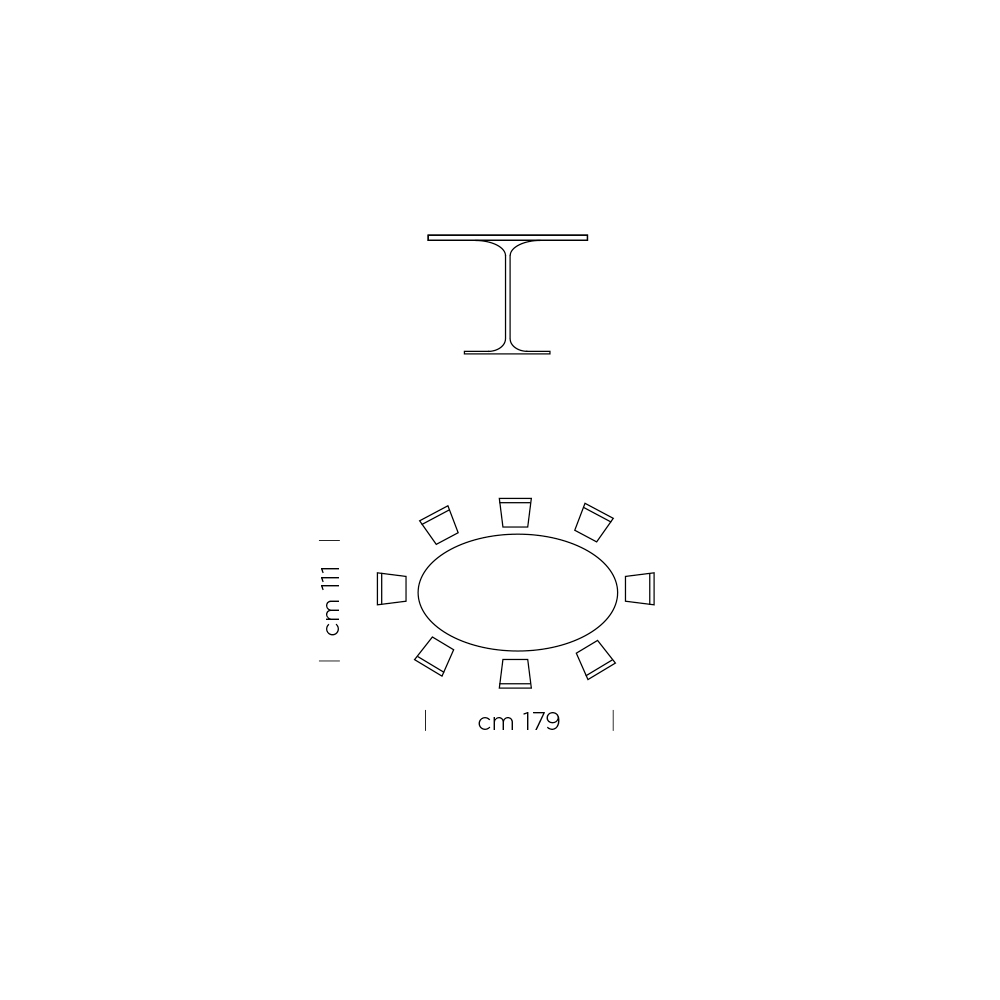 Mesa de comedor con tapa ovalada en laminado líquido fabricada en Italia, de alta calidad.