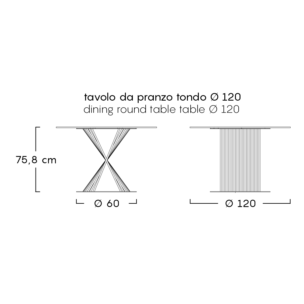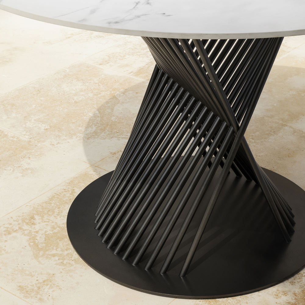 Mesa de comedor de exterior fabricada en Italia, compuesta por una estructura de fundición de aluminio y una tapa redonda de gres porcelánico efecto mármol . La base representa el detalle más original que le da a esta mesa un marcado carácter moderno y un diseño refinado y formal .