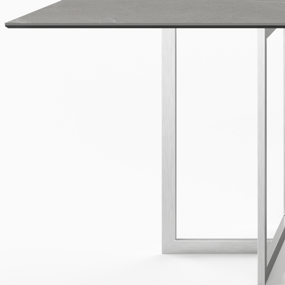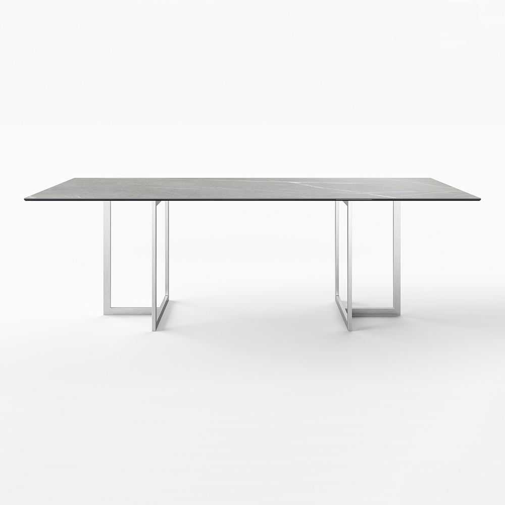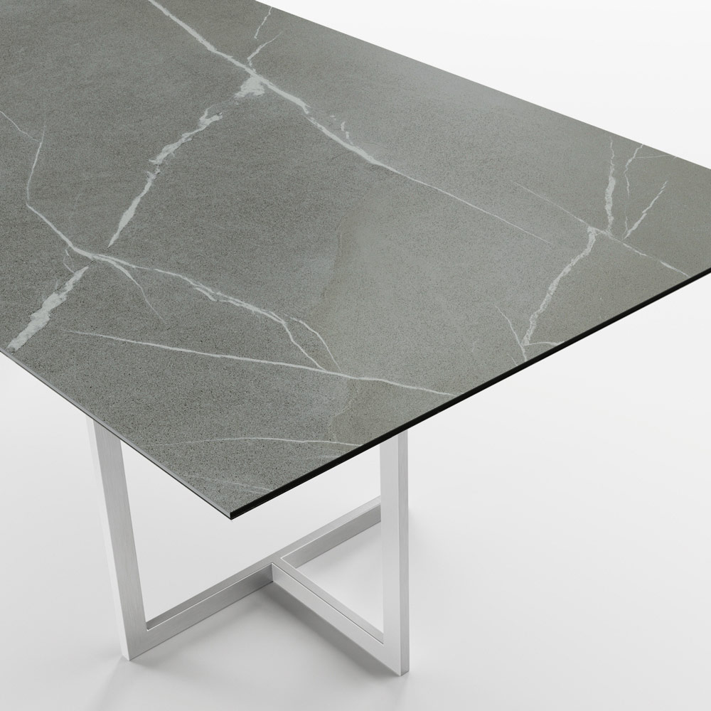 Mesa de comedor en gres porcelánico efecto piedra y acero inoxidable Made in Italy.