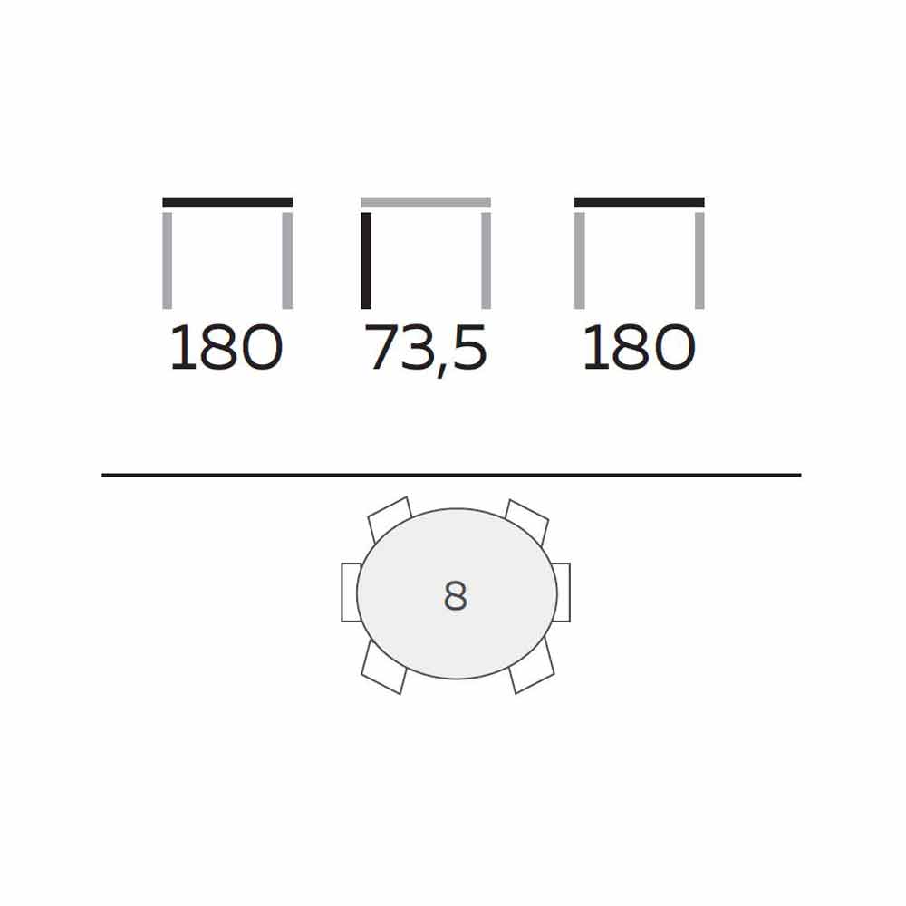 brillante de 1,8 cm de espesor con capacidad para 8 personas mientras que la base es de listones de madera de fresno engrasados a mano en acabado gris negro y es precisamente el elemento que distingue a la mesa gracias a las fuertes líneas que dan dinamismo y movimiento al producto y a toda la estancia.