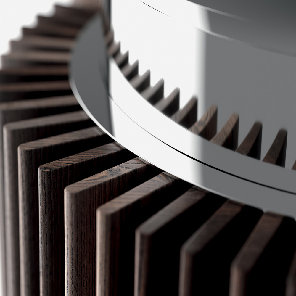 por listones de madera y metal . El punto fuerte de su estética es la base arquitectónica caracterizada por lamas que descansan sobre una