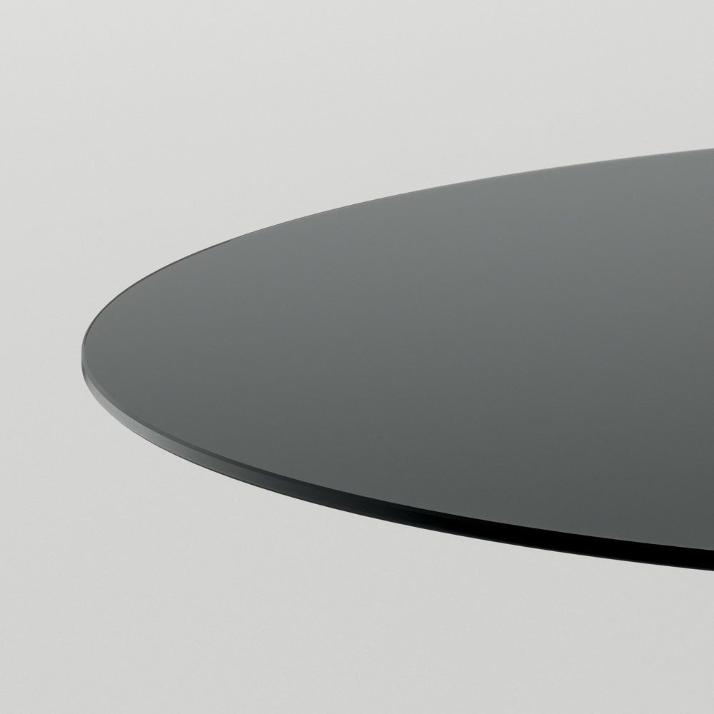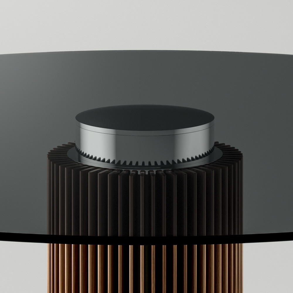 Mesa de comedor redonda con tapa de cristal ahumado y base de madera Made in Italy.