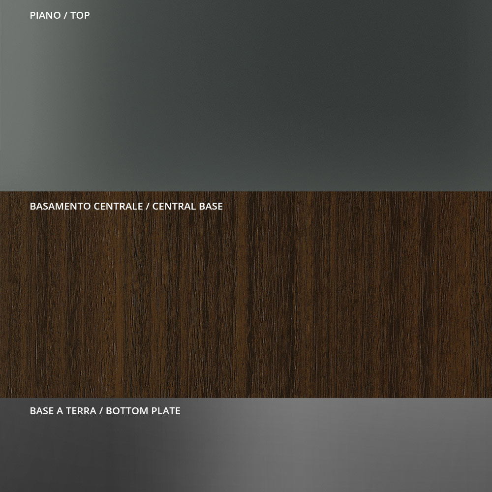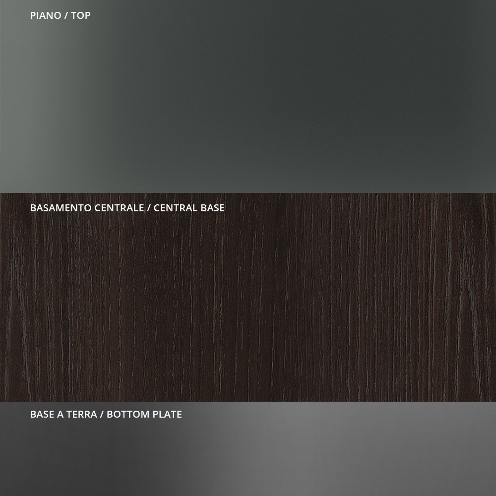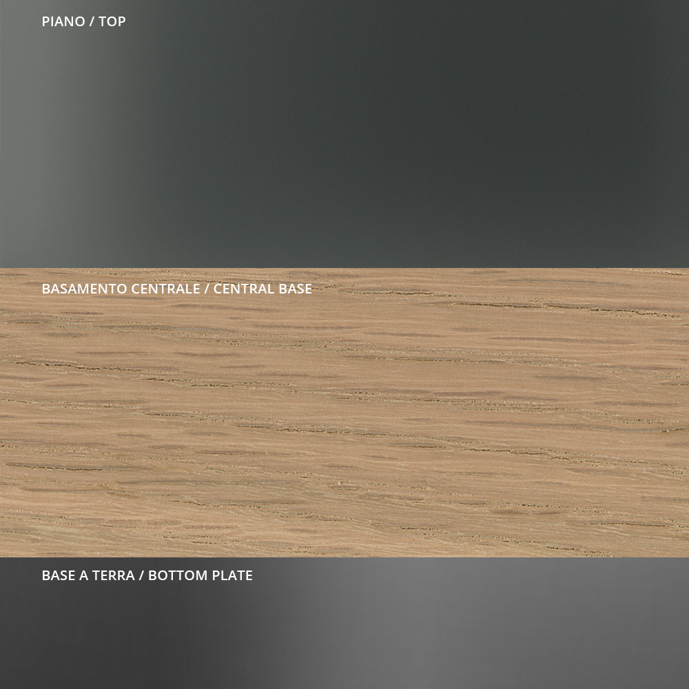 base de metal con acabado gris plomo brillante. El tablero con el borde redondeado aporta suavidad a las formas, mientras que los elementos metálicos completan el diseño de la mesa, enriqueciéndola de