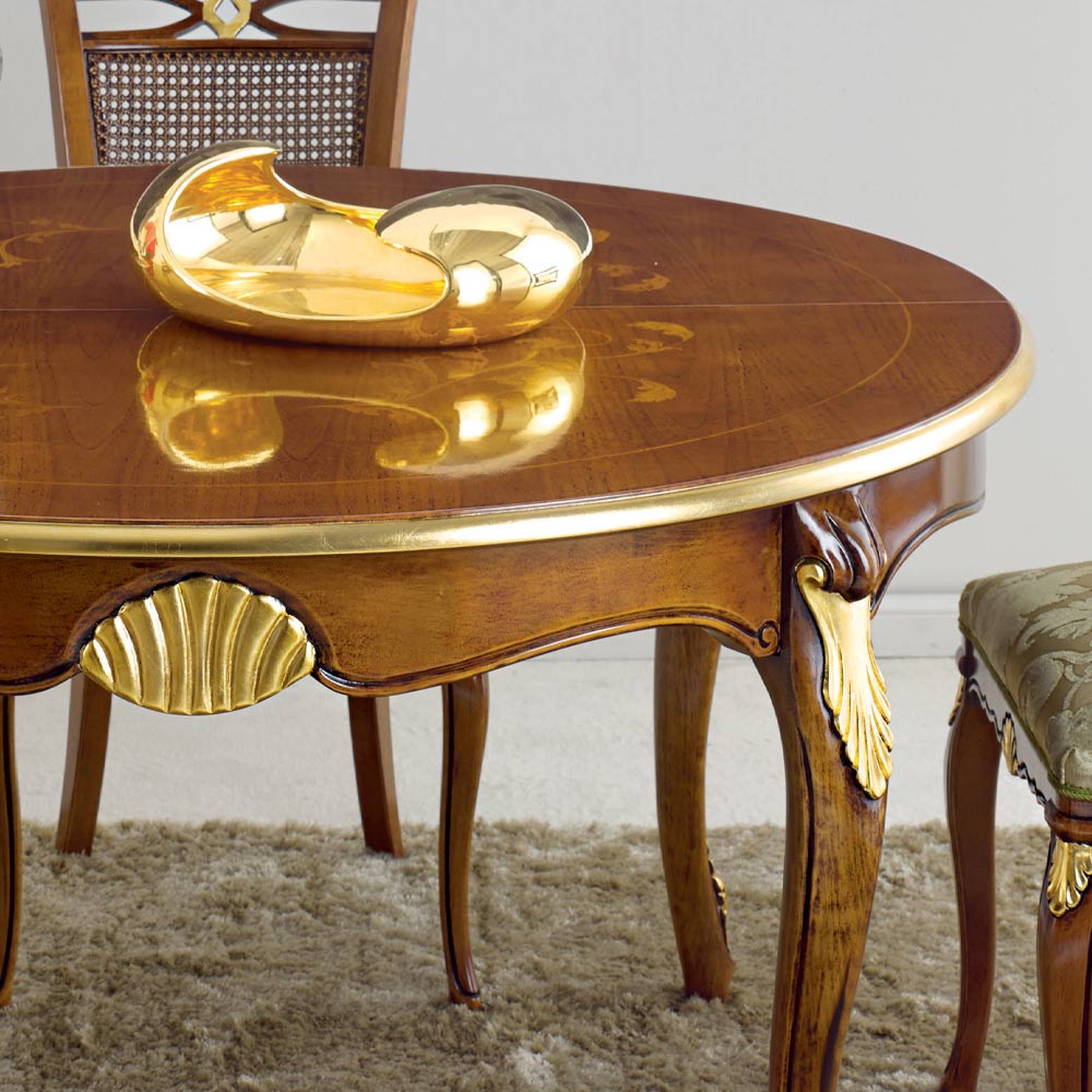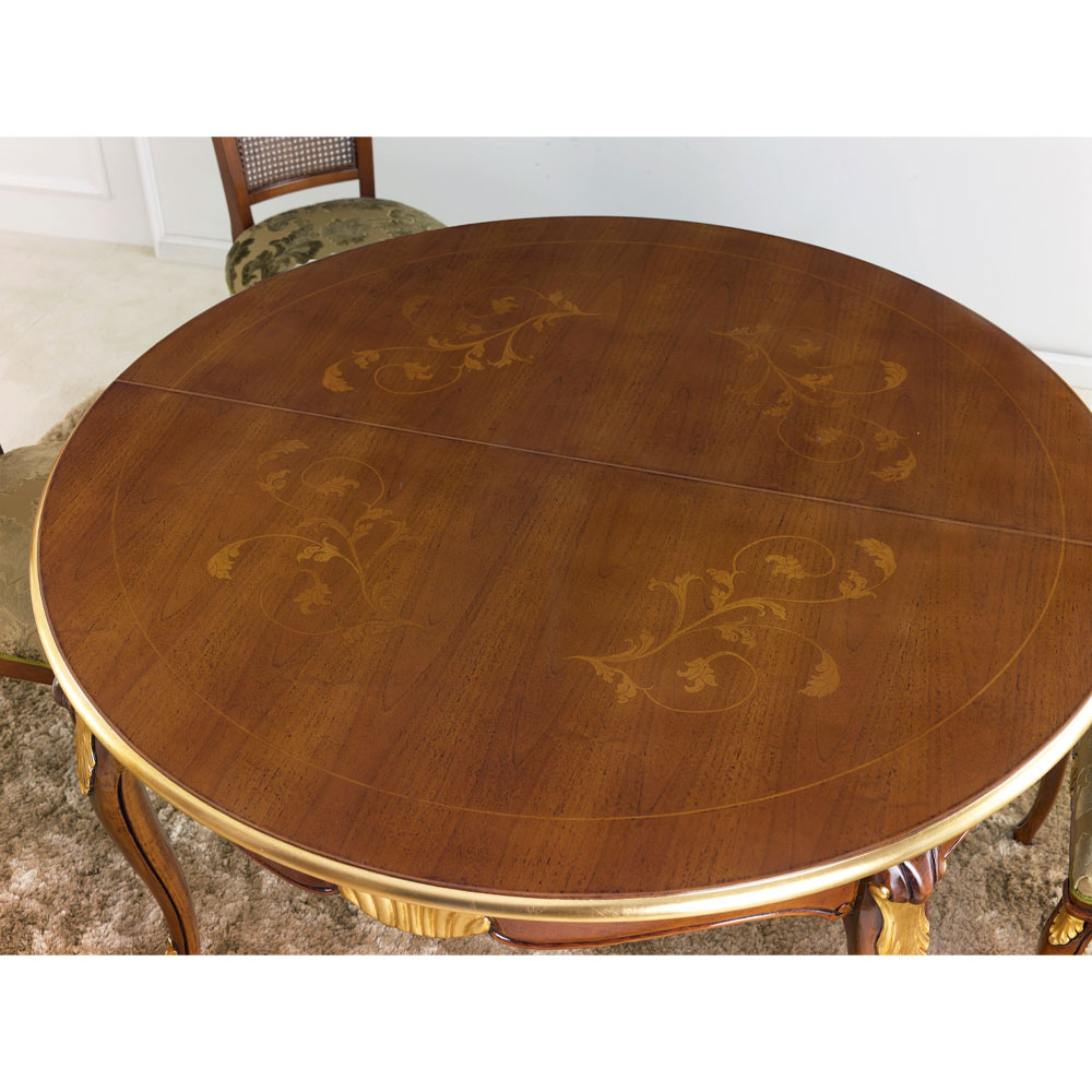 comedor con tapa redonda extensible hasta 240 cm gracias a dos extensiones internas de 50 cm, realizada íntegramente en madera y disponible en los acabados nogal Bassano y madera envejecida oro o blanco y plata.