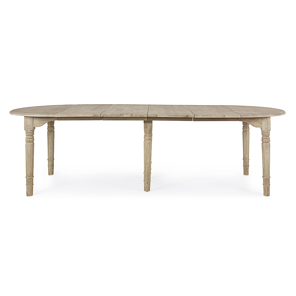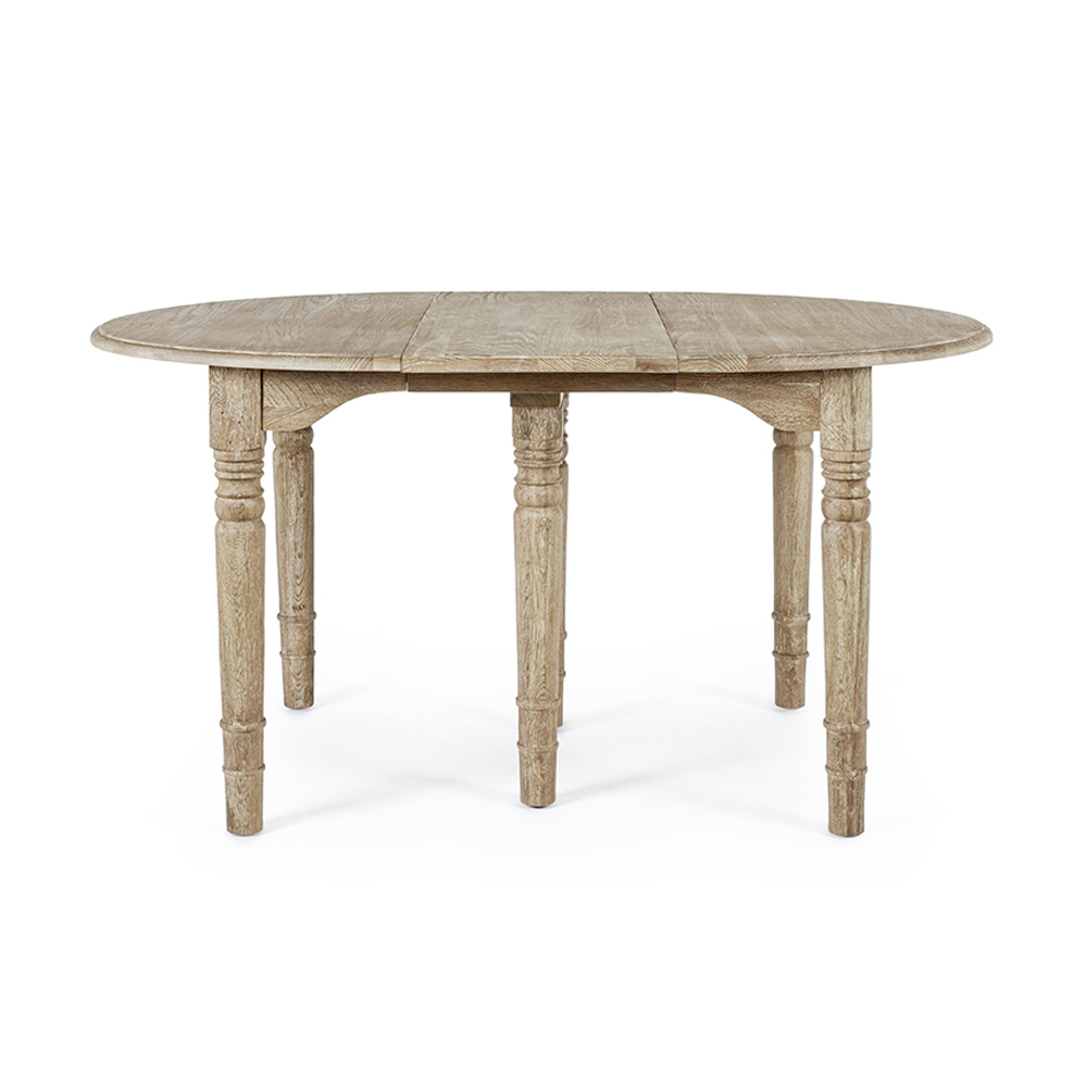 Mesa de comedor redonda y extensible en madera con acabado envejecido hasta 10 personas.