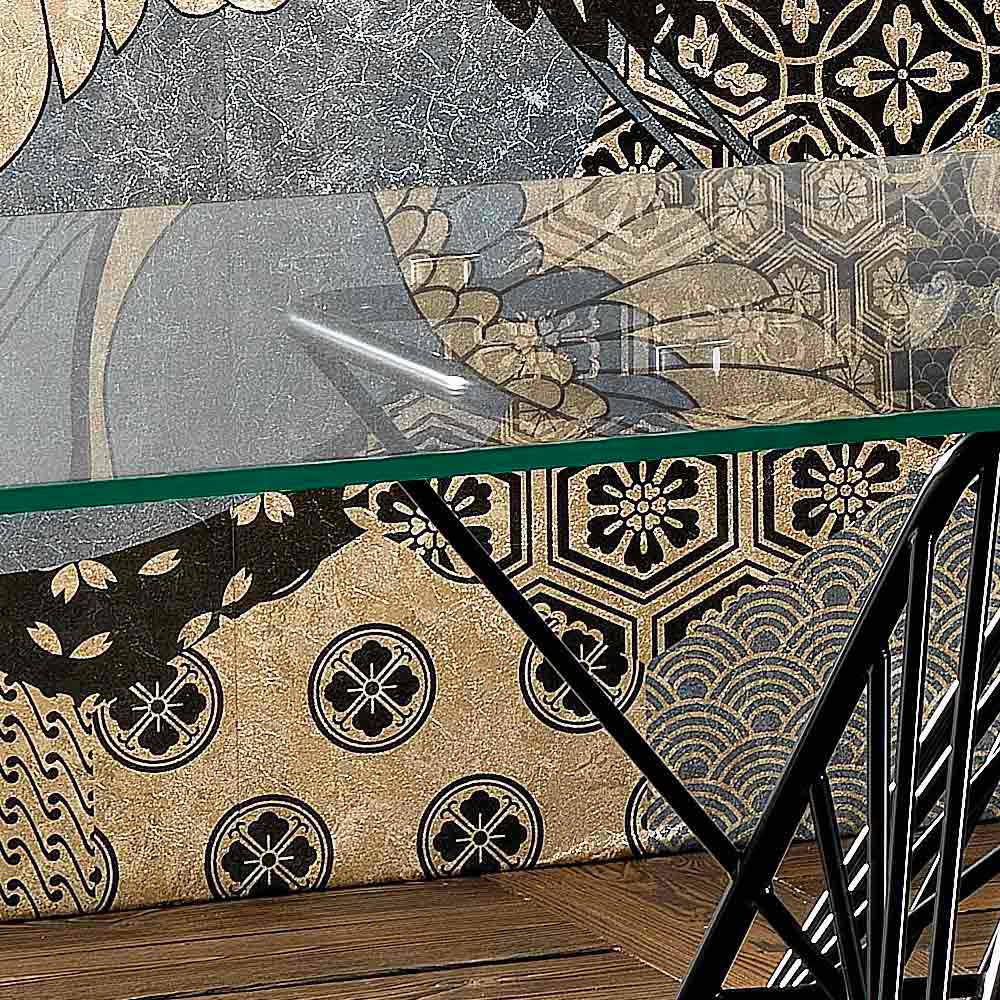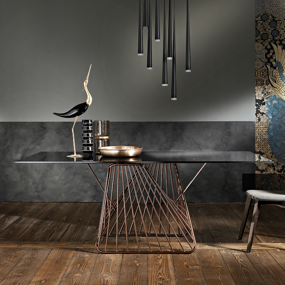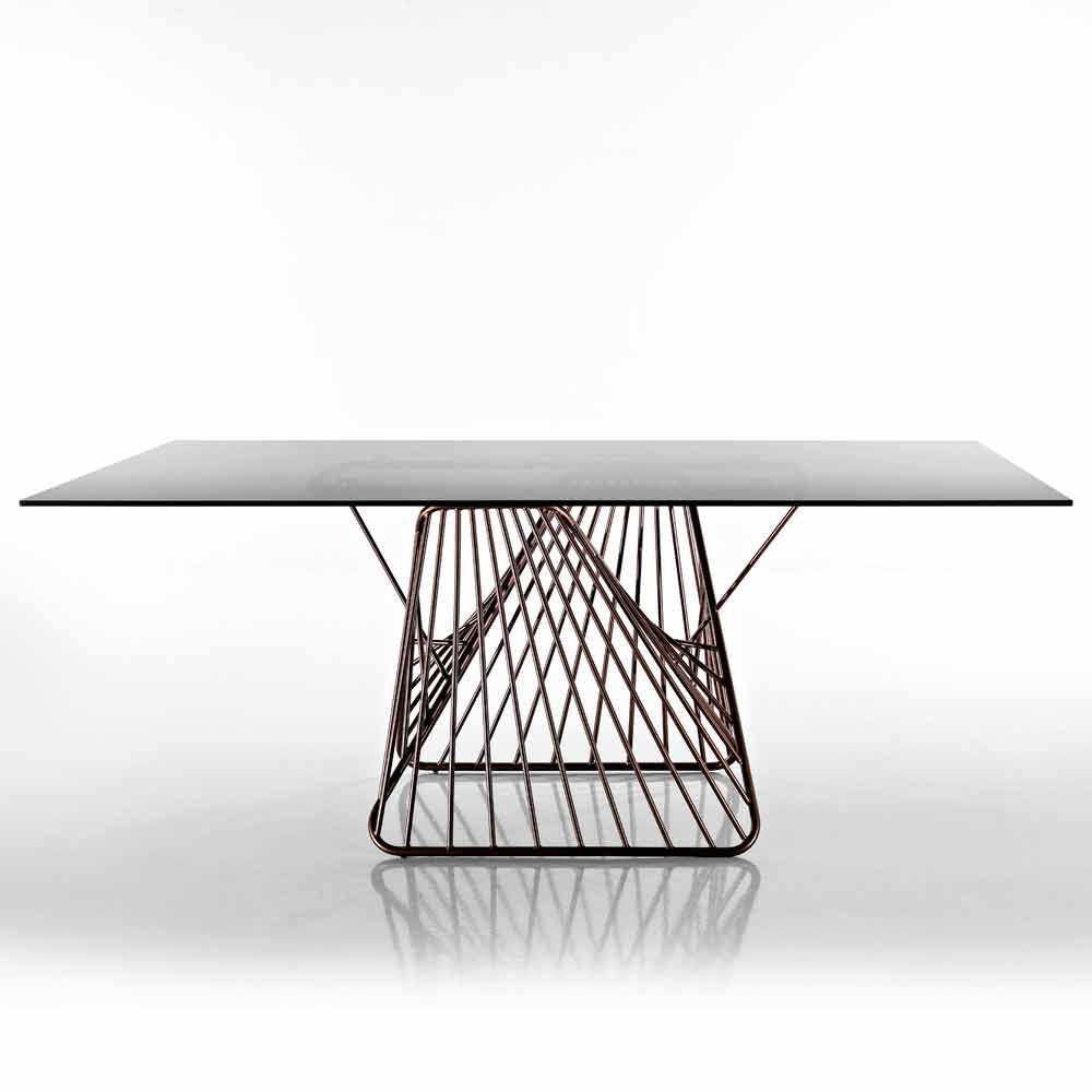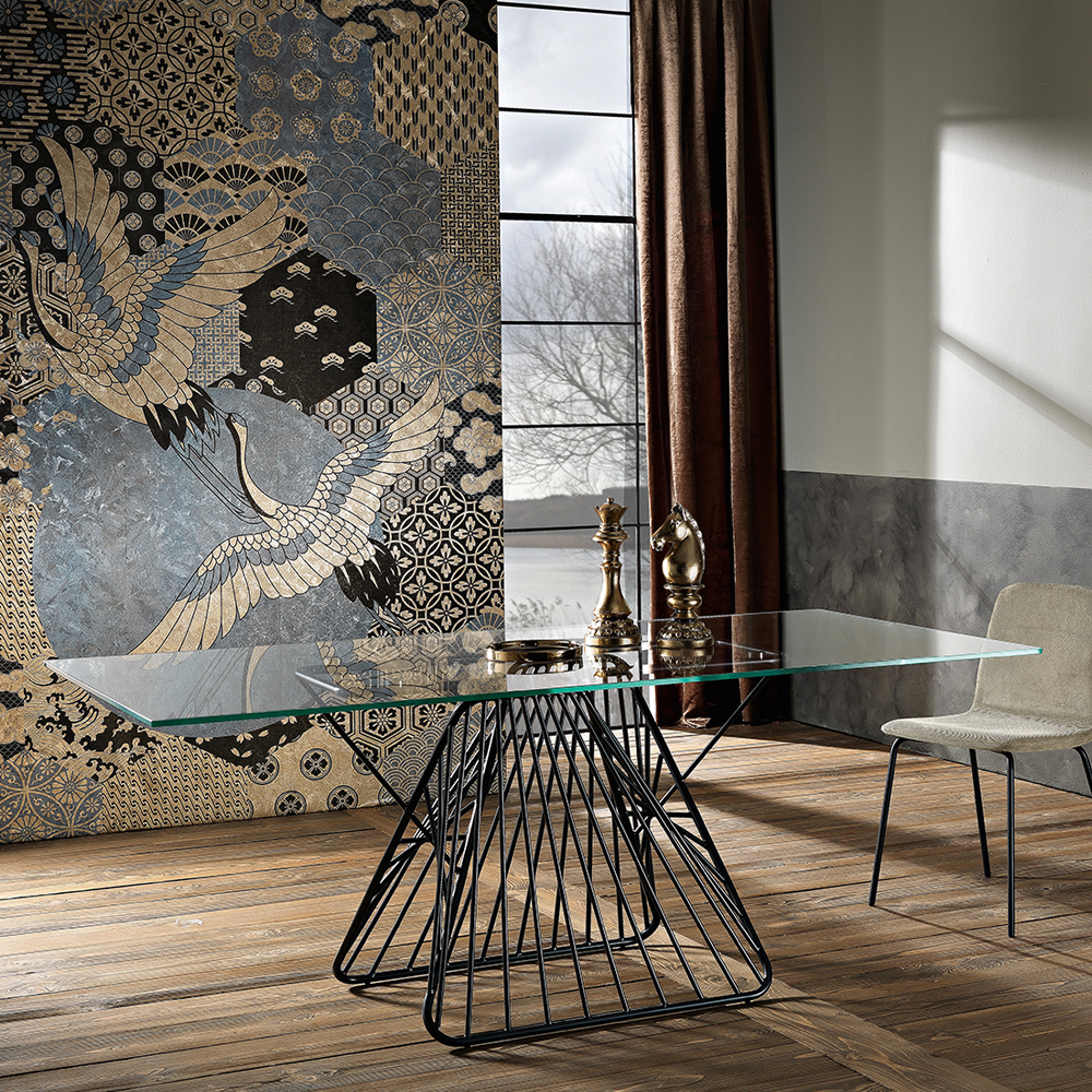 Mitia es una sorprendente mesa fija realizada en Italia con una base de metal pintado y una superficie de vidrio templado (grosor de 12 mm).