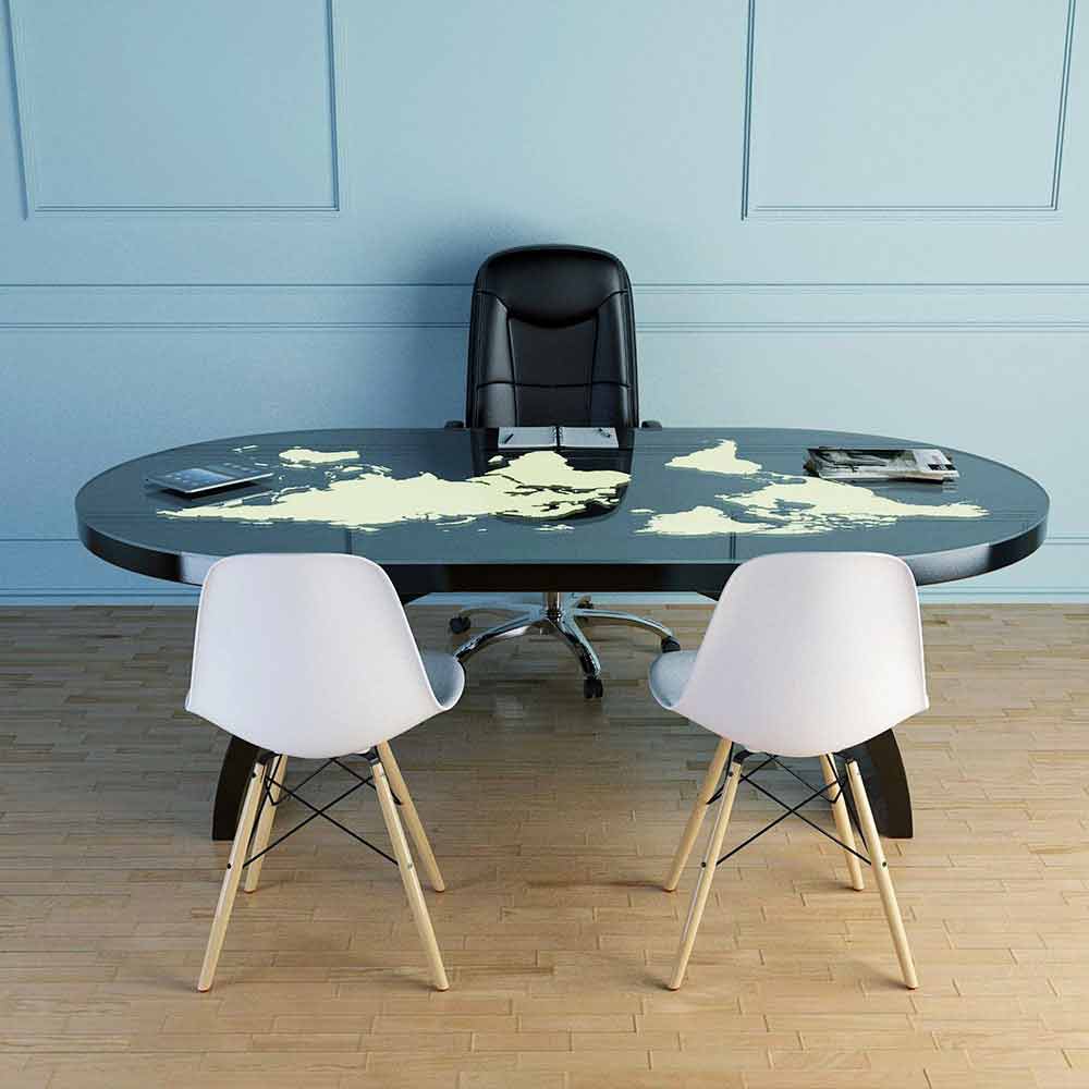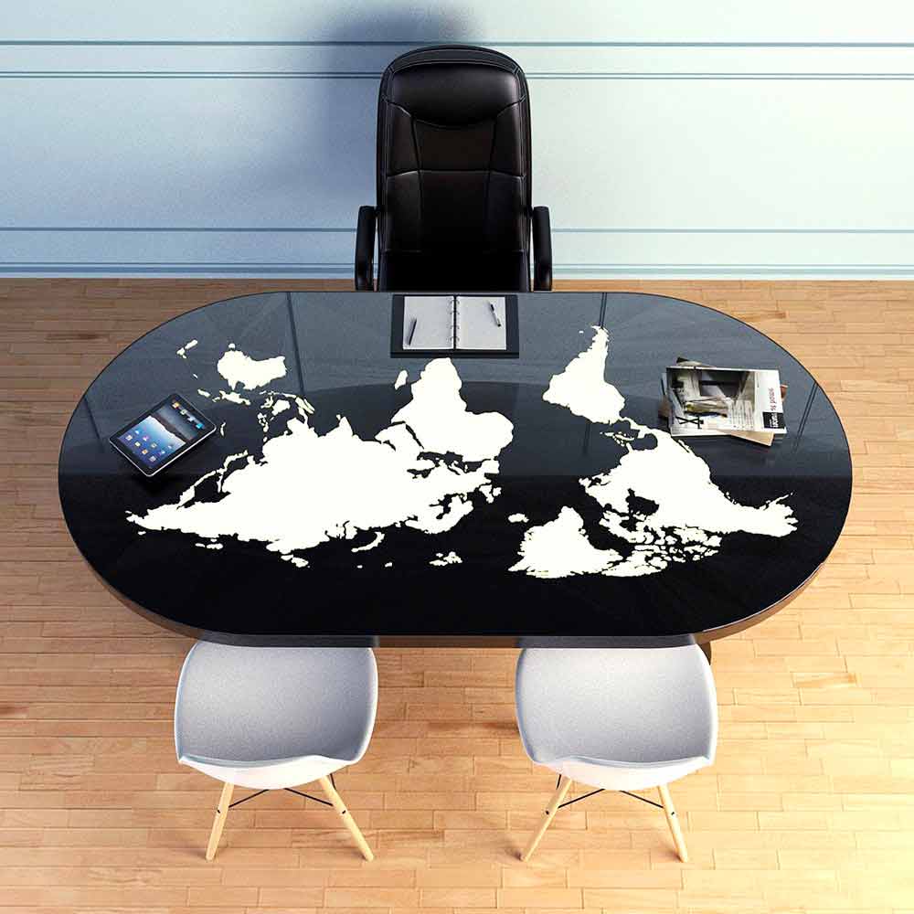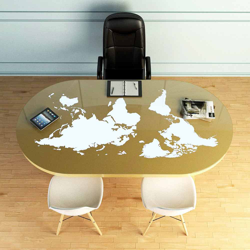Pontida es una mesa de escritorio con un diseño ultramoderno; Realizado en Solid Surface® y tapa de cristal donde está representado el mundo entero que, gracias a la presencia de LED, se ilumina y cambia de color según desees.