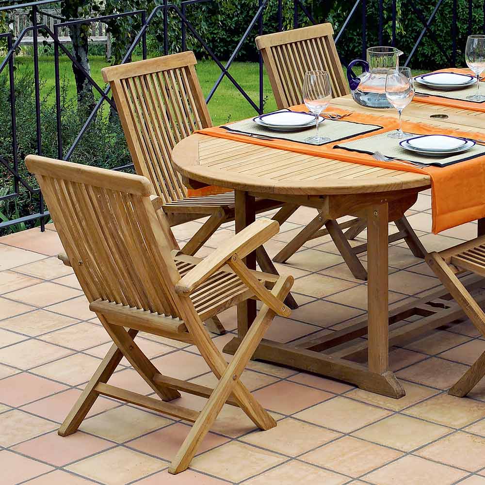 Mesa extensible de exterior con 2 sillones con reposabrazos y 4 sillas de madera de teca natural . La madera de teca utilizada es de origen indonesio , procedente de bosques controlados y sostenibles (MADERA LEGAL EN INDONESIA). Es un material extremadamente duradero y estable, resistente a los agentes atmosféricos, hongos, plagas e insectos. Contiene altos niveles de aceites naturales que la hacen resistente y limitan la absorción de humedad .
