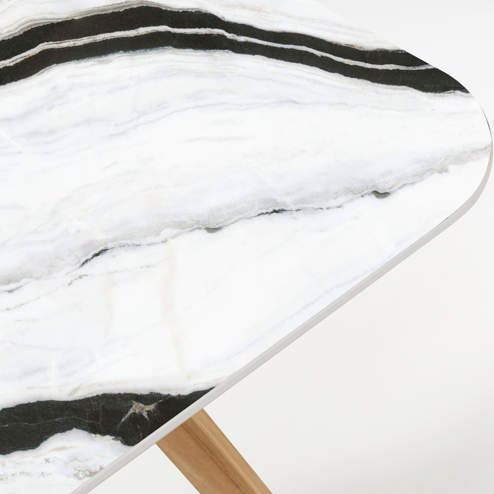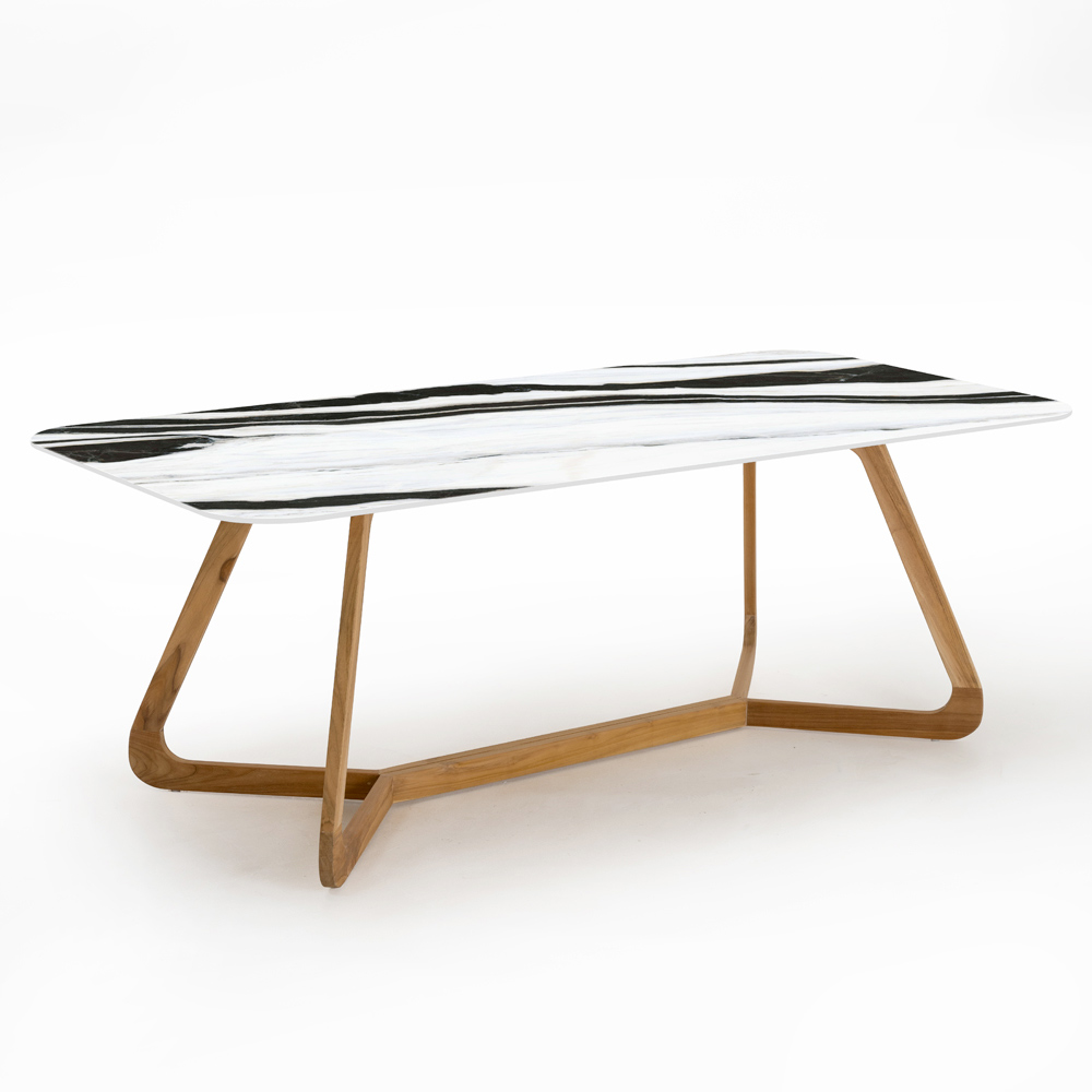 Esta mesa de exterior es una auténtica obra maestra del diseño, que combina la calidez de la madera con la elegante pureza de la cerámica Panda White . Su llamativo tablero, con una audaz veta negra sobre un fondo blanco puro, no solo es visualmente impactante, sino también increíblemente duradero y fácil de mantener, perfecto para cualquier espacio exterior.