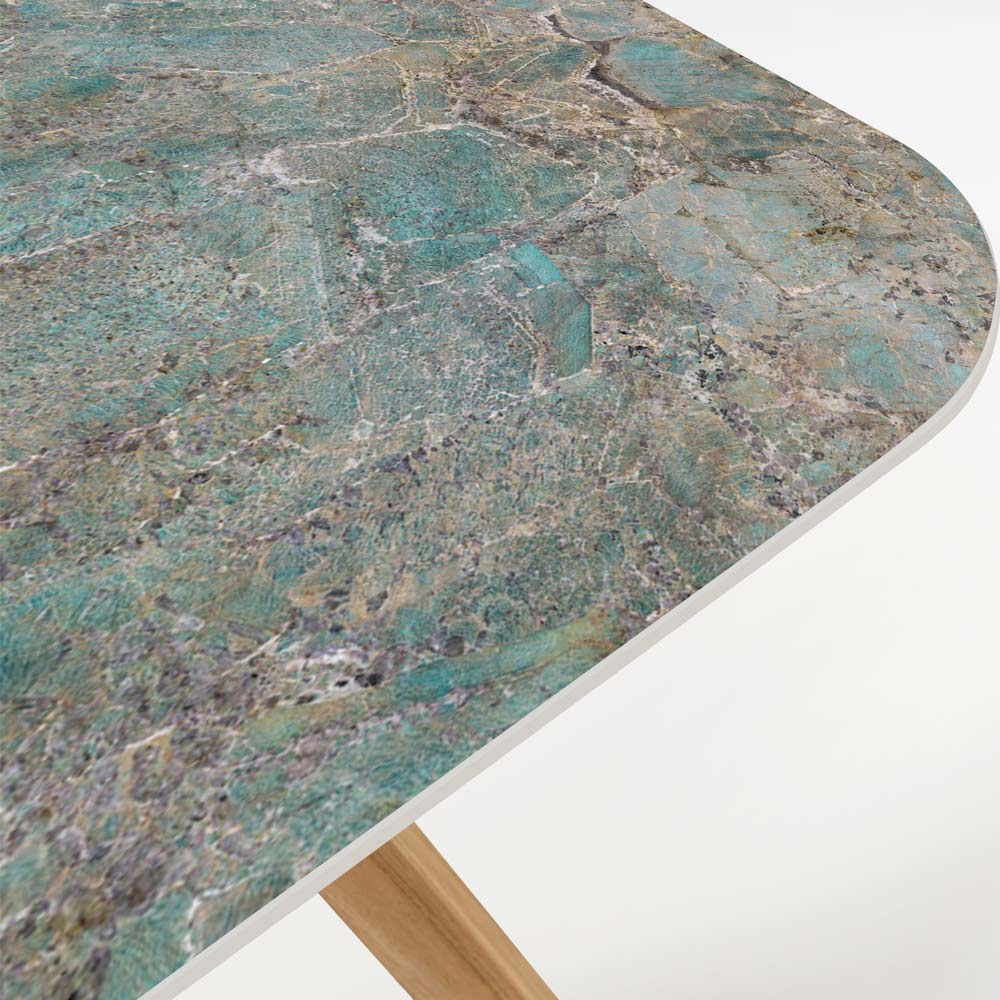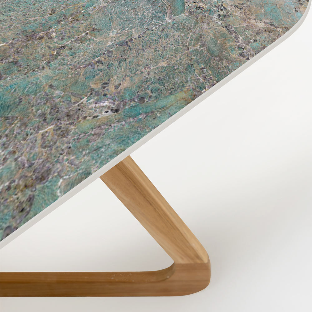 Made in Italy. Esta exclusiva mesa de exterior es una auténtica joya del diseño, que combina la elegancia de la madera con la modernidad de la cerámica. El tablero, elaborado con cerámica de alta calidad con un impresionante tono verde antiguo , ofrece una resistencia excepcional a la intemperie y una belleza duradera.