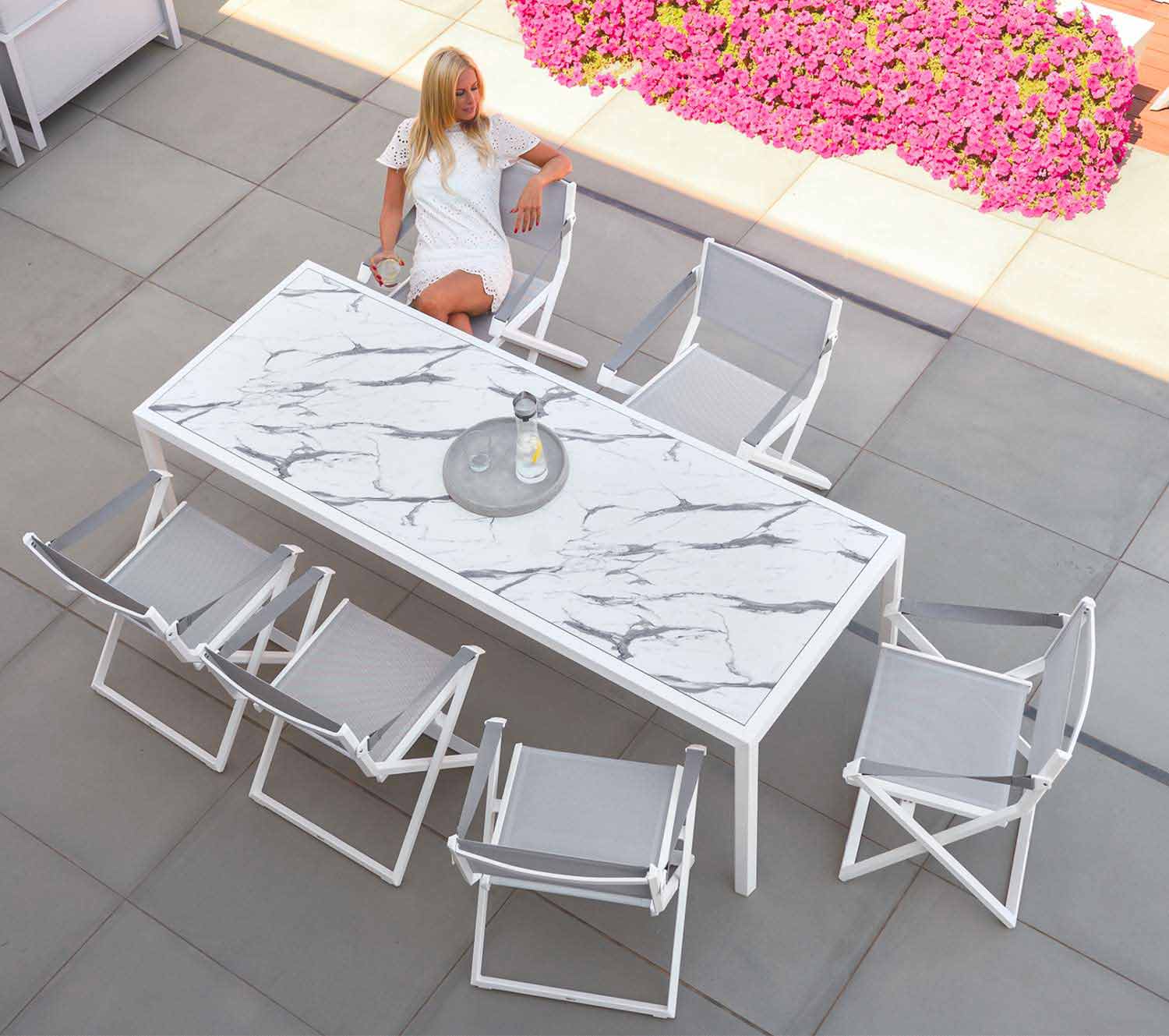 Mesa de exterior moderna, estructura de aluminio y tapa de diseño laminado HPL