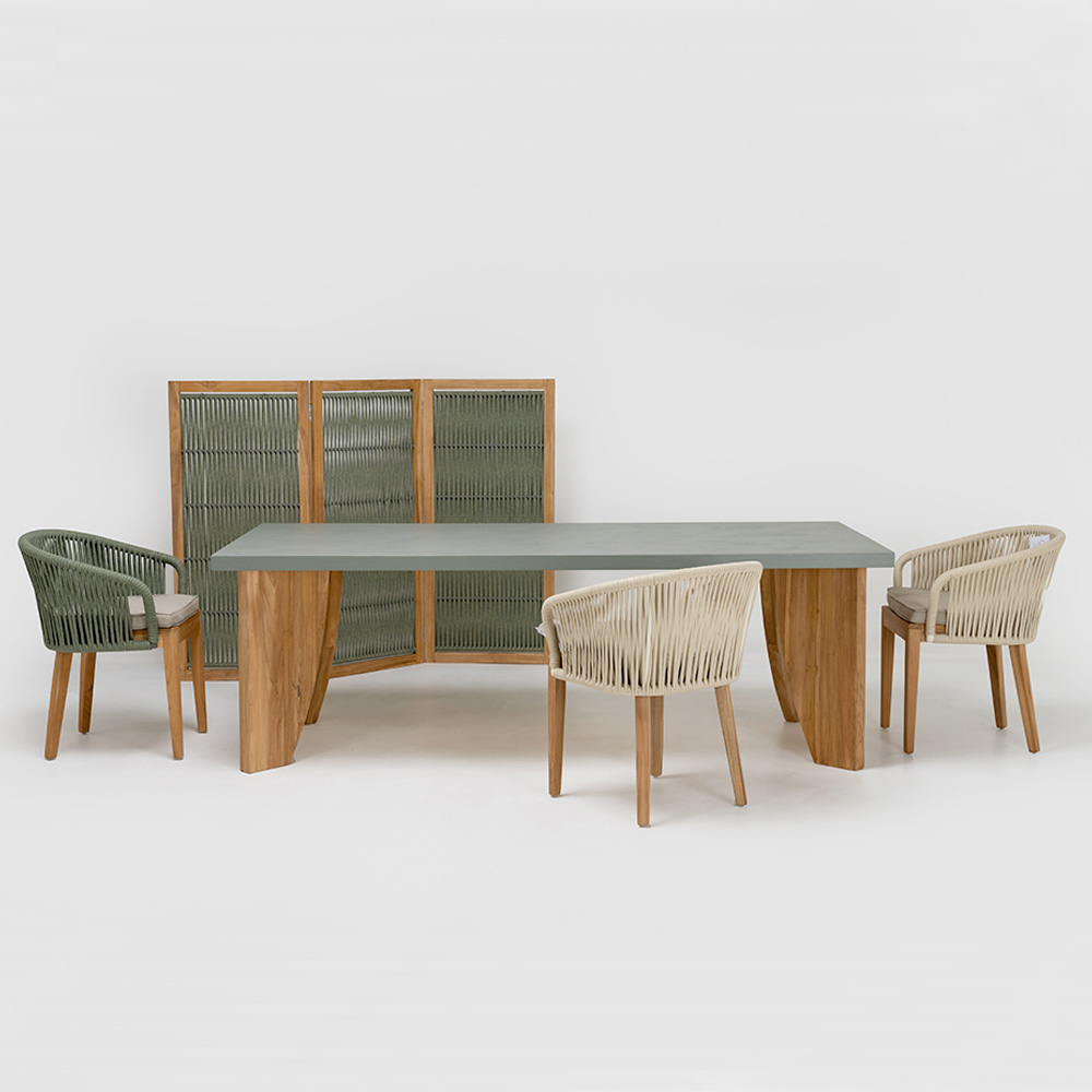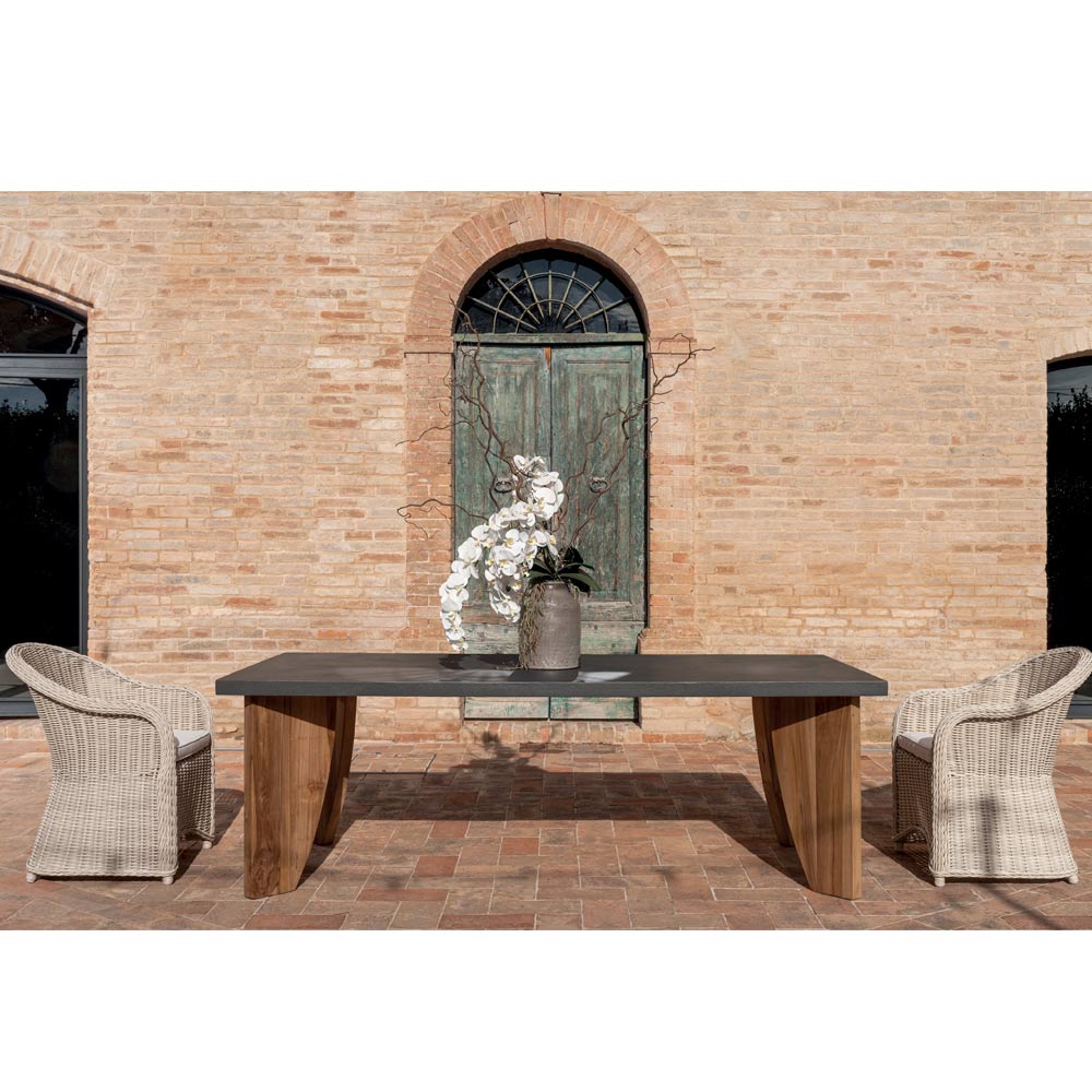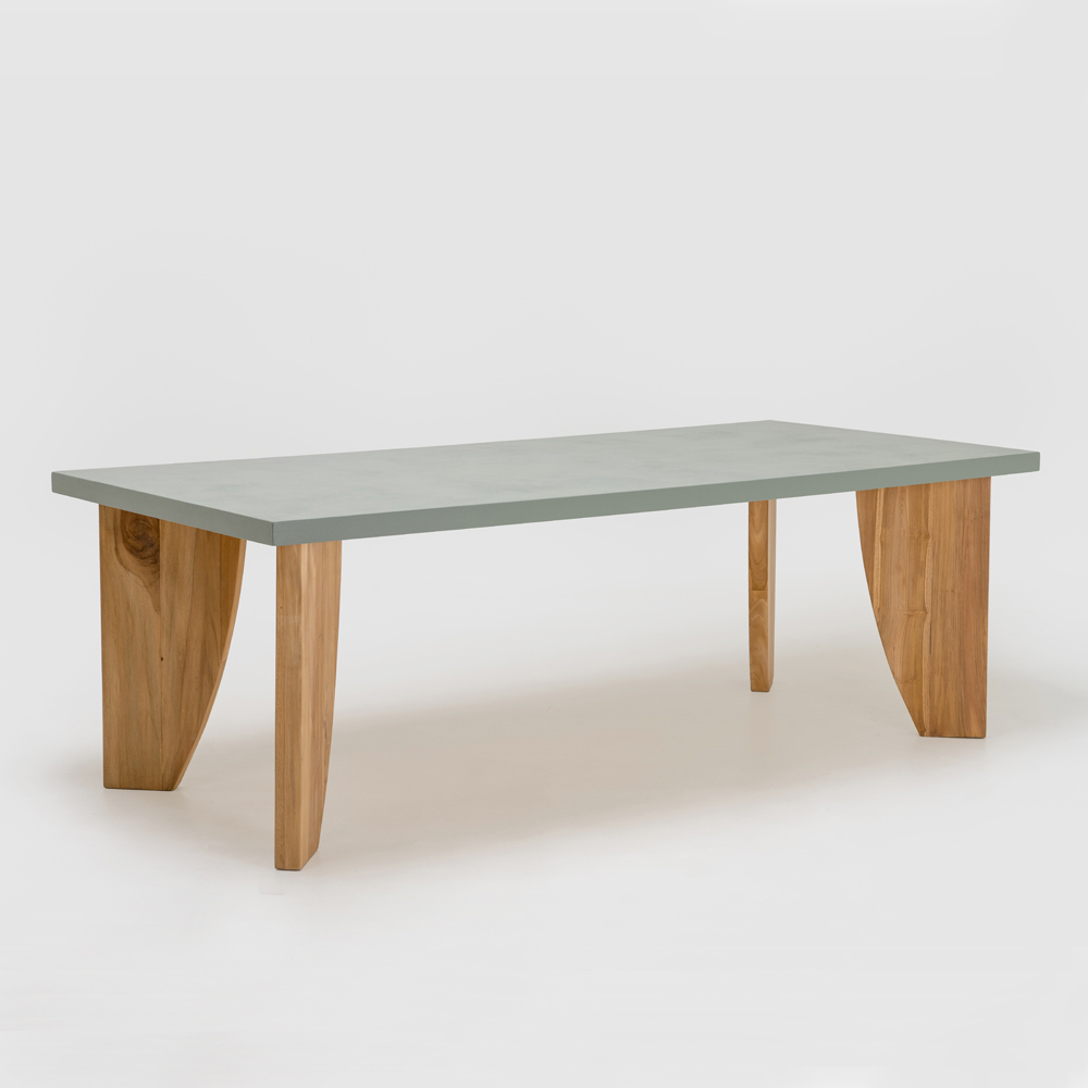 Mesa de comedor realizada con tablero contrachapado marino Okumé (espesor 25 mm) con acabado exterior de microcemento (3 mm de grosor), canto perimetral de 50 mm de altura y base de teca maciza natural de 60 mm de grosor (fijación a 45°), íntegramente fabricado en Italia. El acabado es impactante porque realza la textura, a la vez que se siente refinado al tacto.