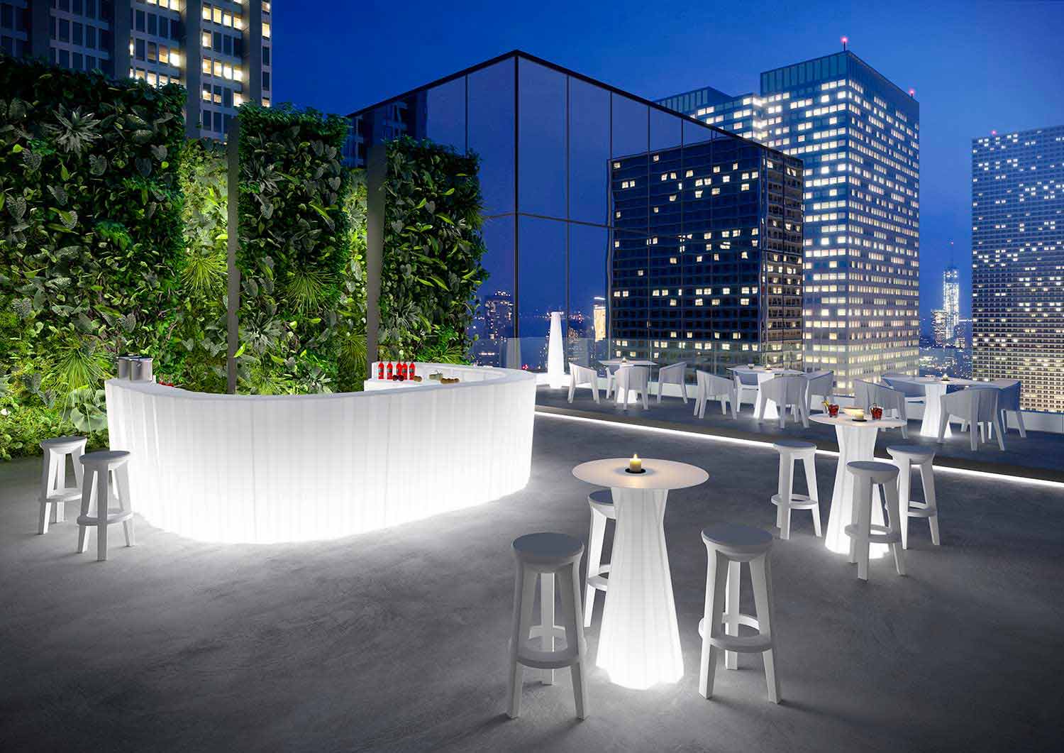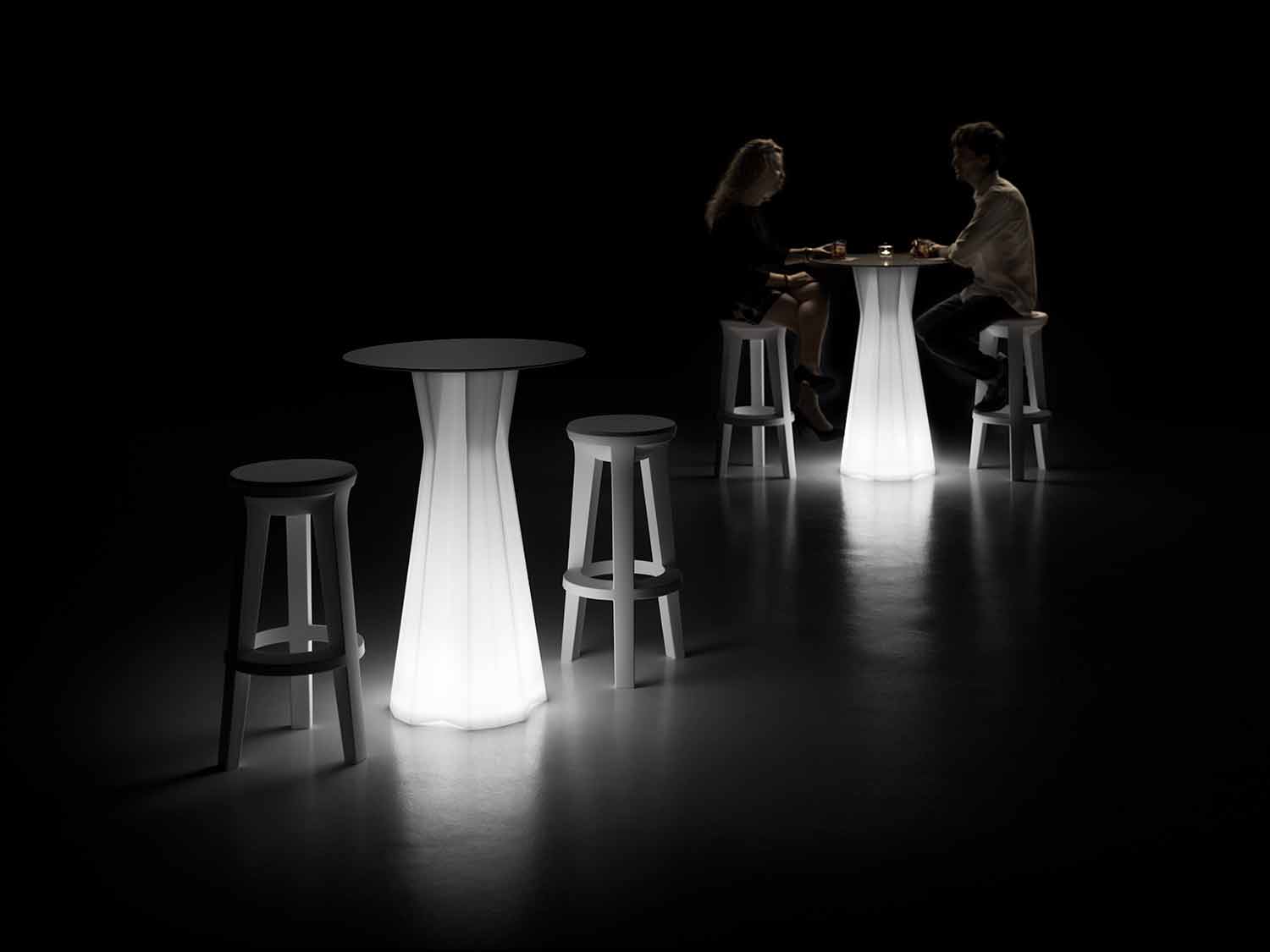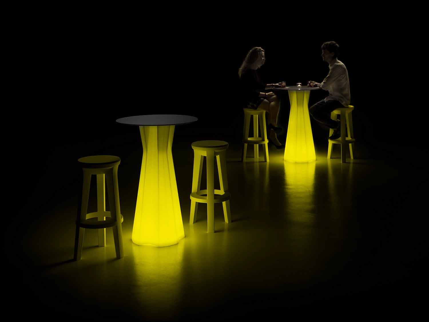 polietileno , lo que le aporta versatilidad y resistencia al calor, al sol y a los golpes. Ideal en combinación con taburetes altos luminosos para completar el equipamiento de ambientes que necesitan carácter y personalidad.