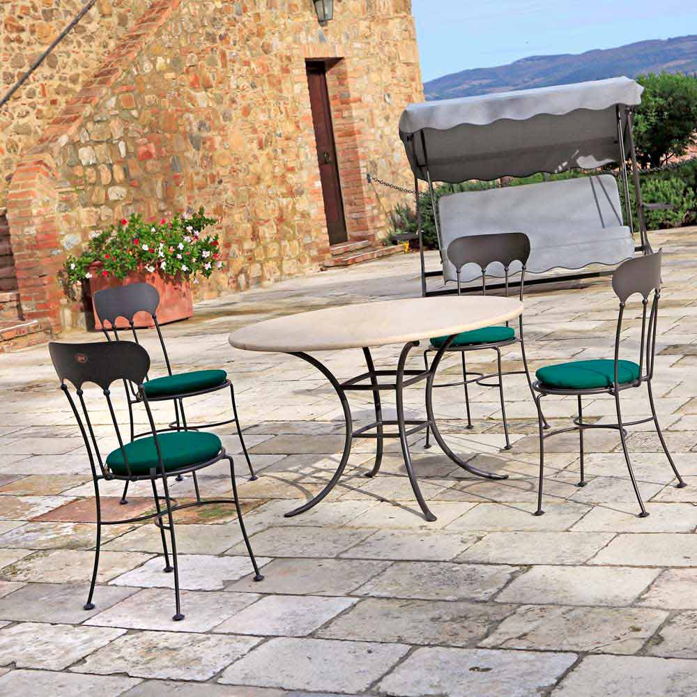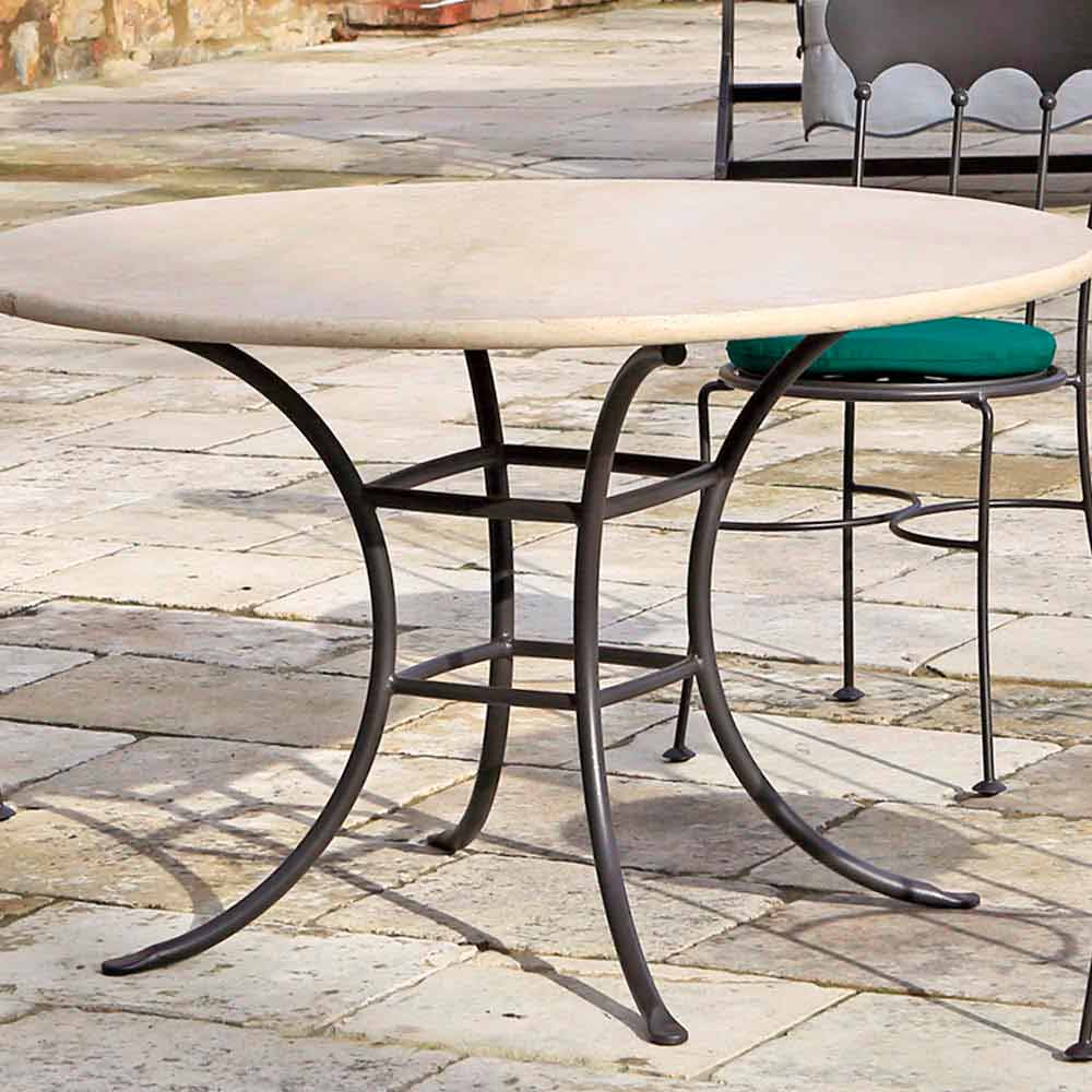 Mesa de comedor para exterior fabricada en Italia con base de hierro pintado acabado antracita y tapa redonda en travertino claro . Una idea de decoración que recuerda un estilo más clásico gracias al uso de materiales y acabados con alma antigua. La estructura ofrece al producto una estabilidad óptima mientras que el tratamiento de galvanizado en caliente lo hace particularmente resistente a cualquier tipo de corrosión, garantizando la inoxidabilidad del metal durante décadas y enriqueciendo su estética con un revestimiento de textura rugosa que realza el sabor antiguo de su formas. La artesanía 100% italiana junto con la atención al detalle subraya aún más su valor y valor, ofreciendo así un producto final de alta calidad capaz de caracterizar cualquier espacio al aire libre gracias a su fuerte personalidad clásica y elegancia sin tiempo de la tapa de travertino que da la mesa su estética anticuada.