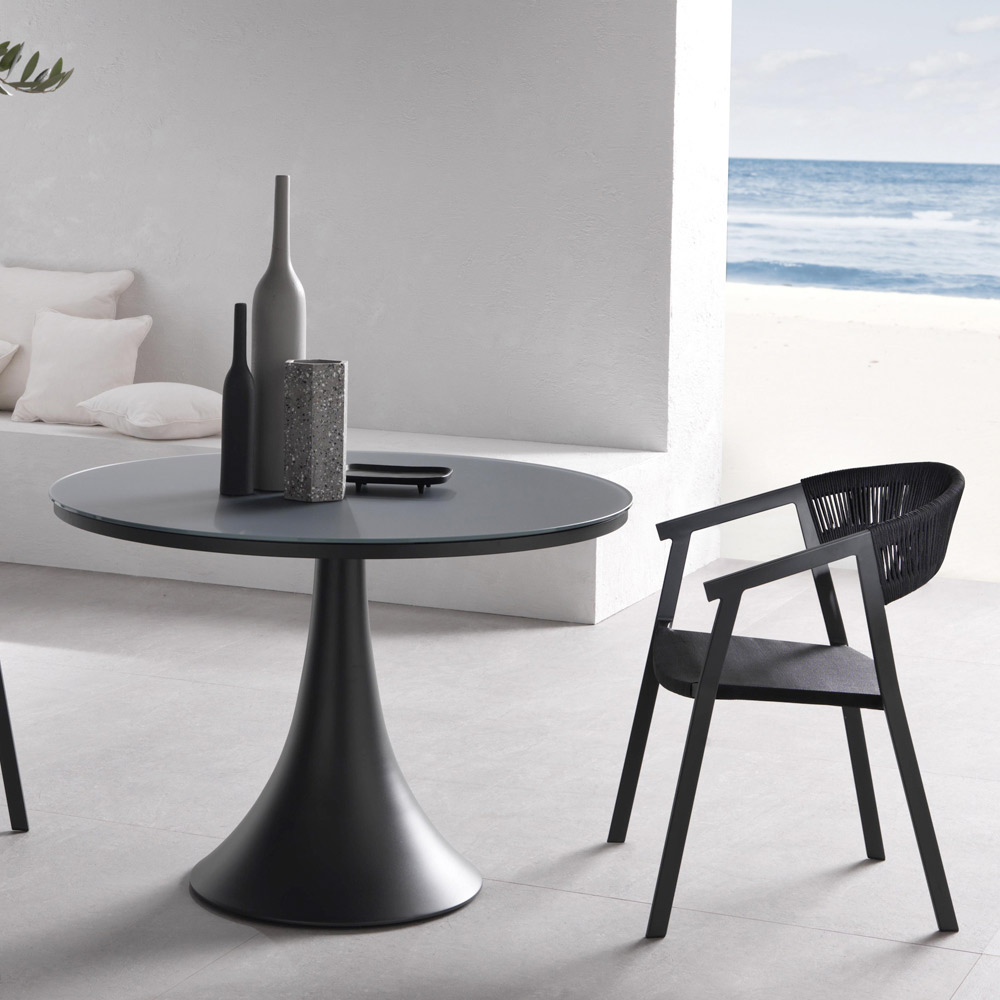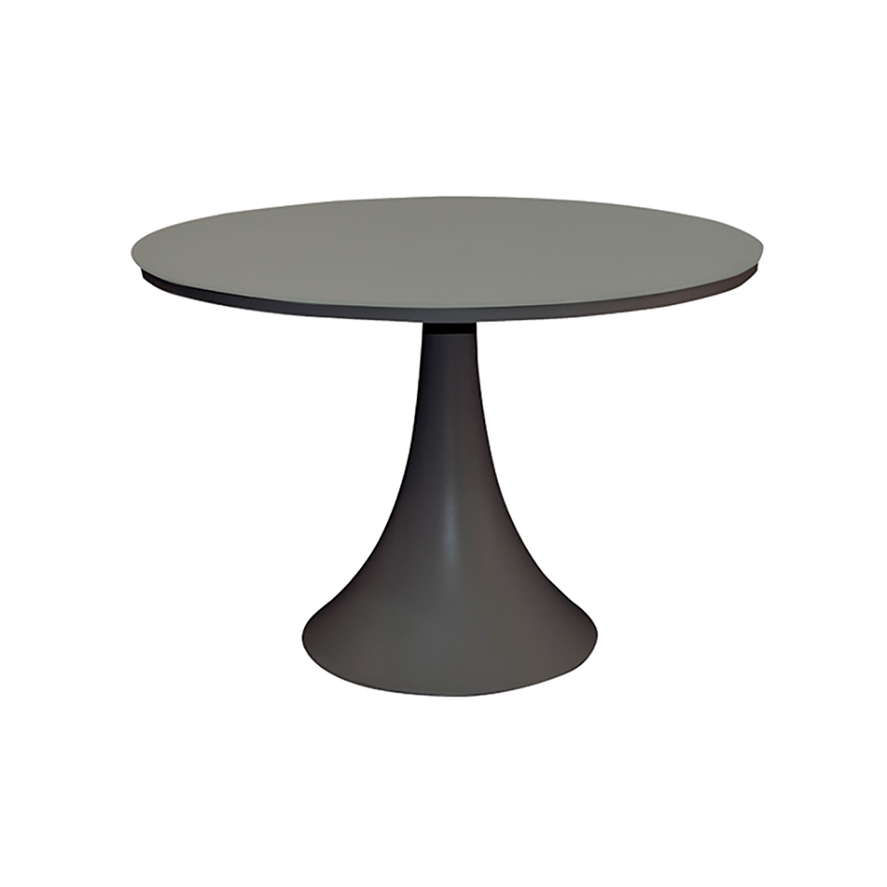 Mesa de jardín redonda con estructura de aluminio pintado con polvos epoxi y tapa trasera de cristal pintado