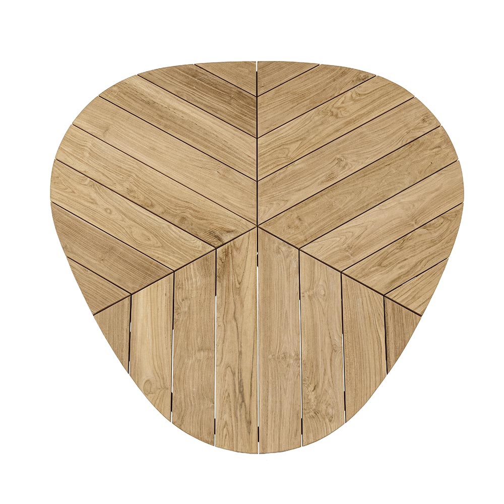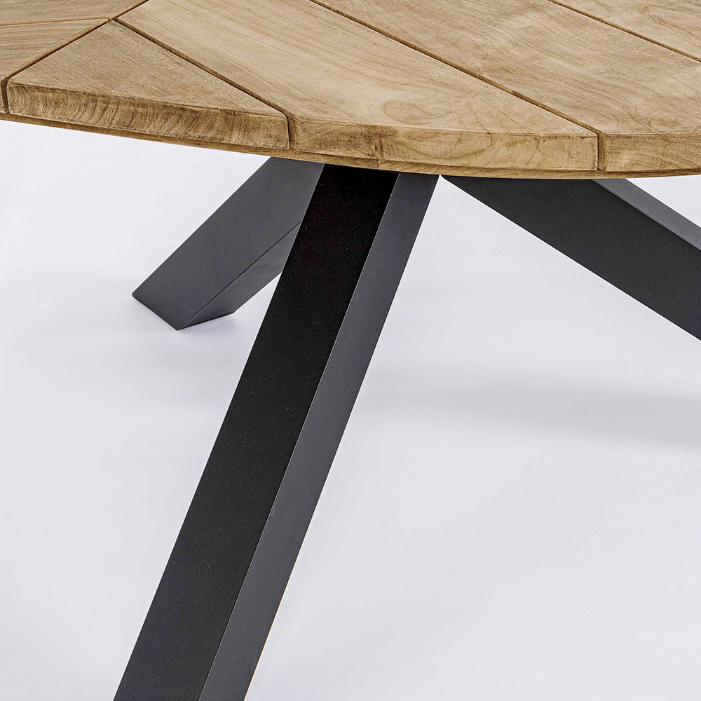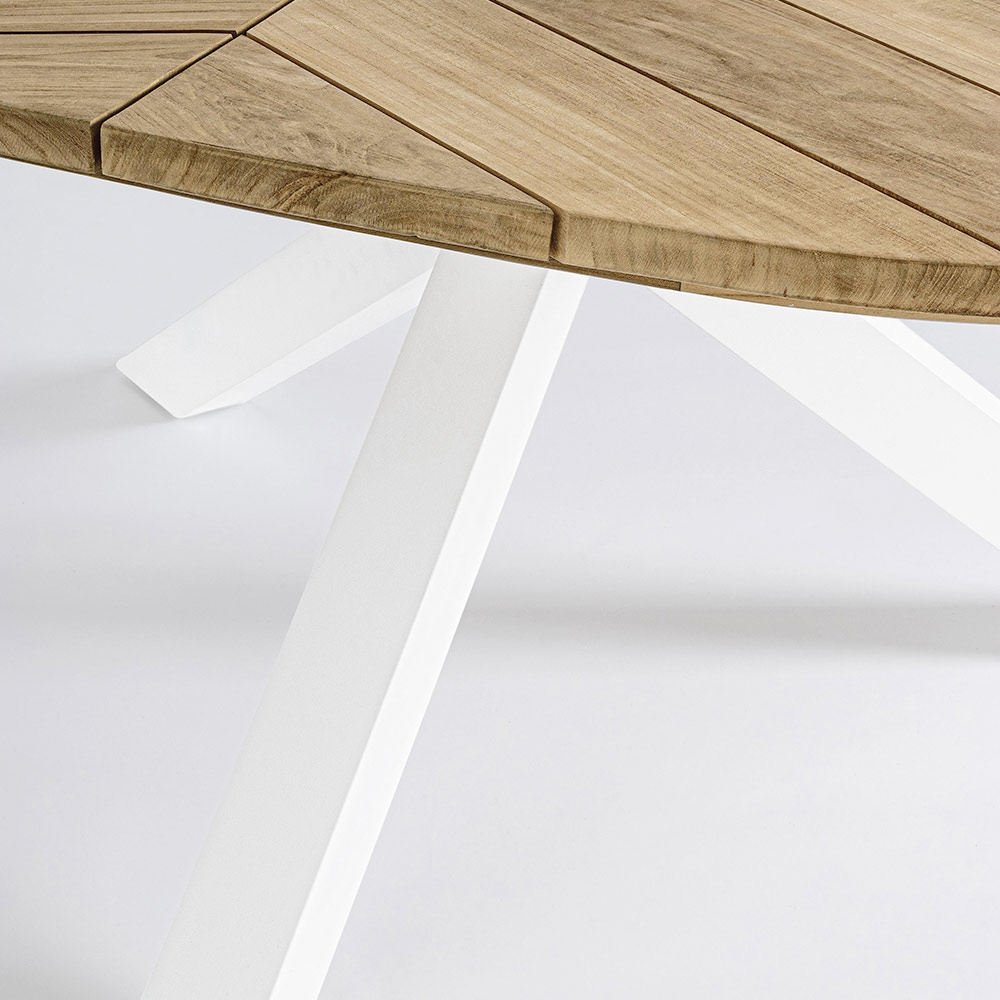 Mesa de comedor redonda para exterior en aluminio con tapa en madera de teca de calidad.