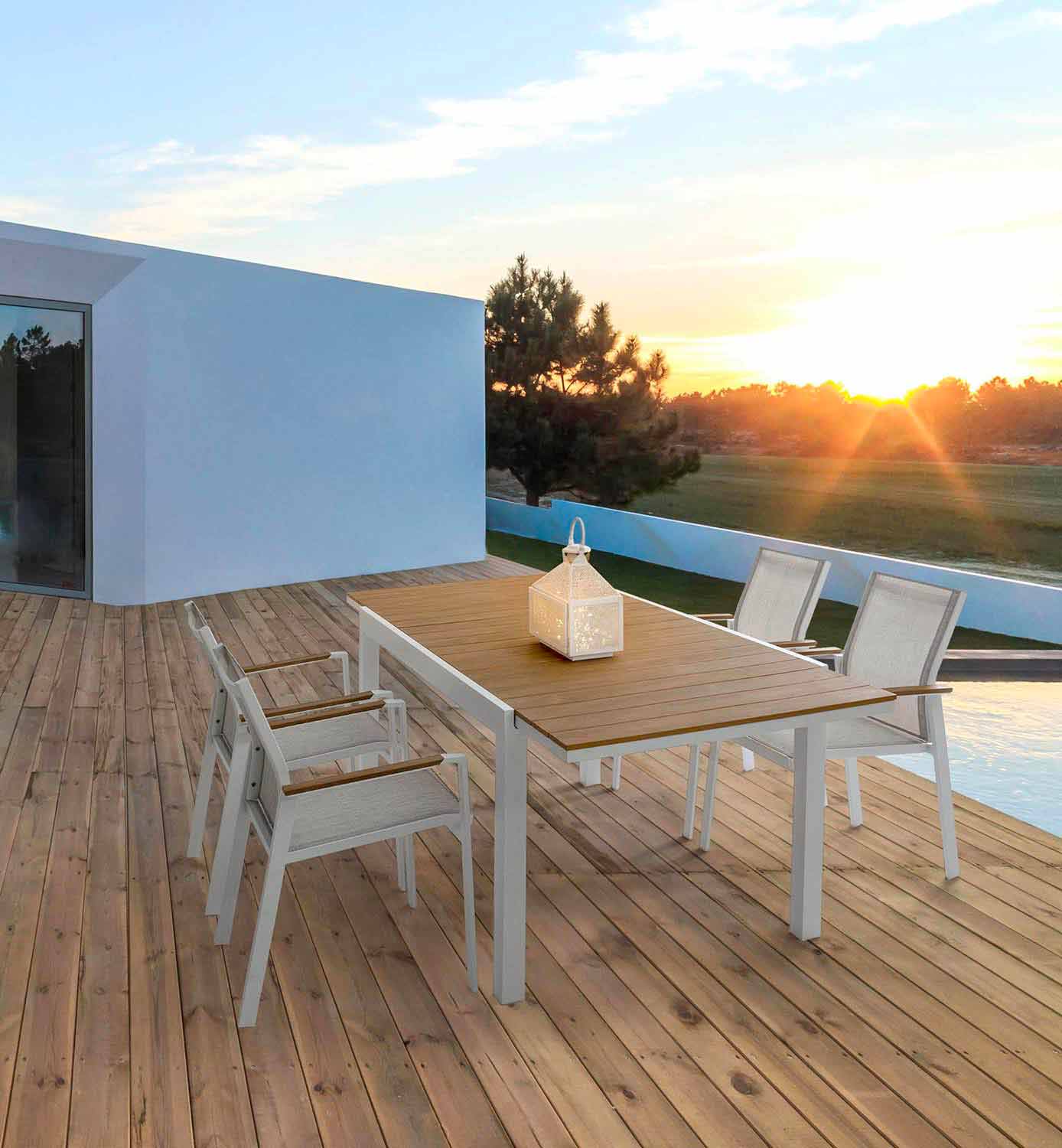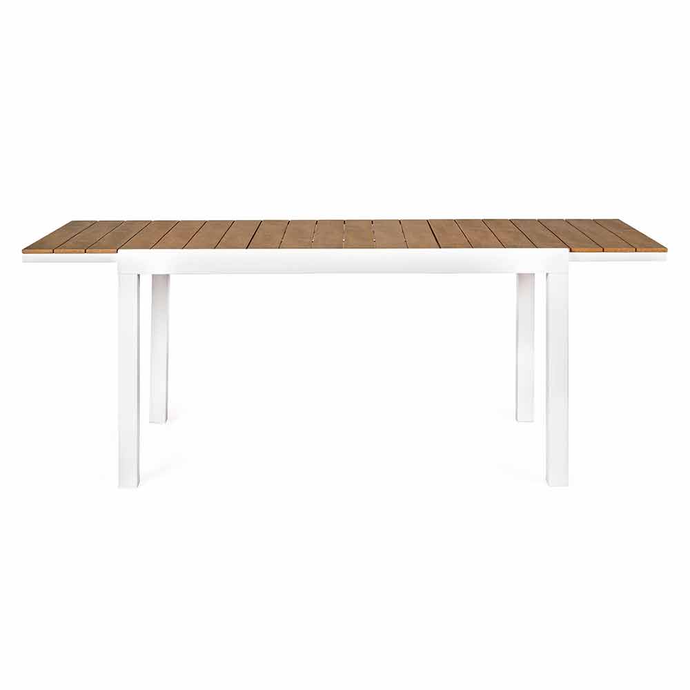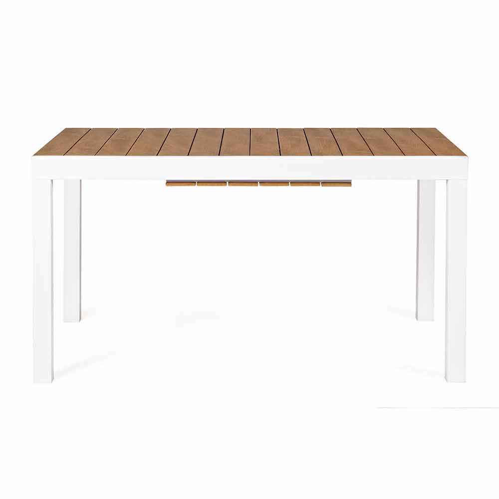Mesa de exterior extensible con extensión central oculta, diseño moderno, estructura de aluminio blanco con tapa de madera.