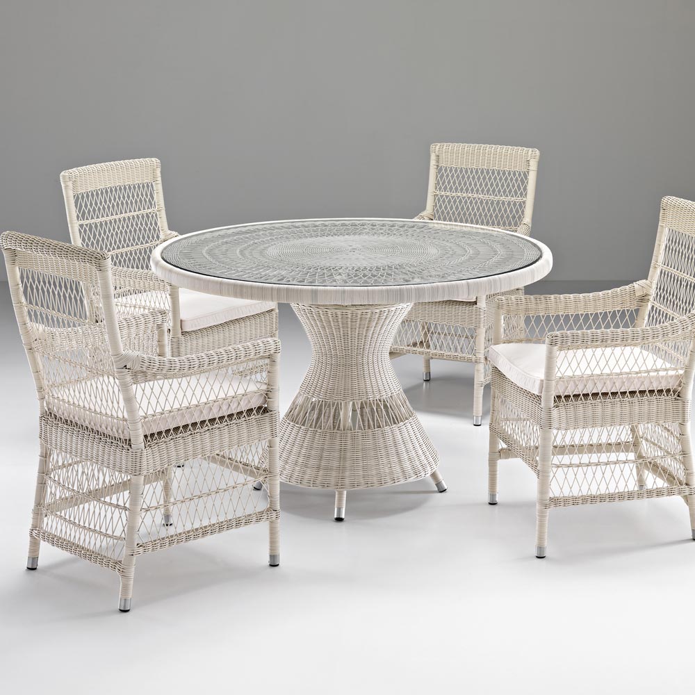 tapa de cristal, 4 sillones con reposabrazos con estructura de aluminio y tejido de Polyrattan marca REHAU. Esta composición se caracteriza por su marcado