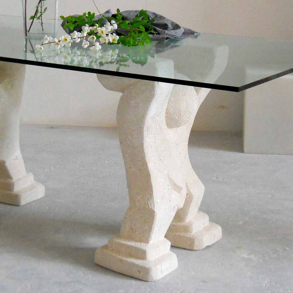 Mesa de comedor rectangular, realizada enteramente en Italia, con base doble de piedra natural de Vicenza, esculpida manualmente directamende del bloque de piedra.