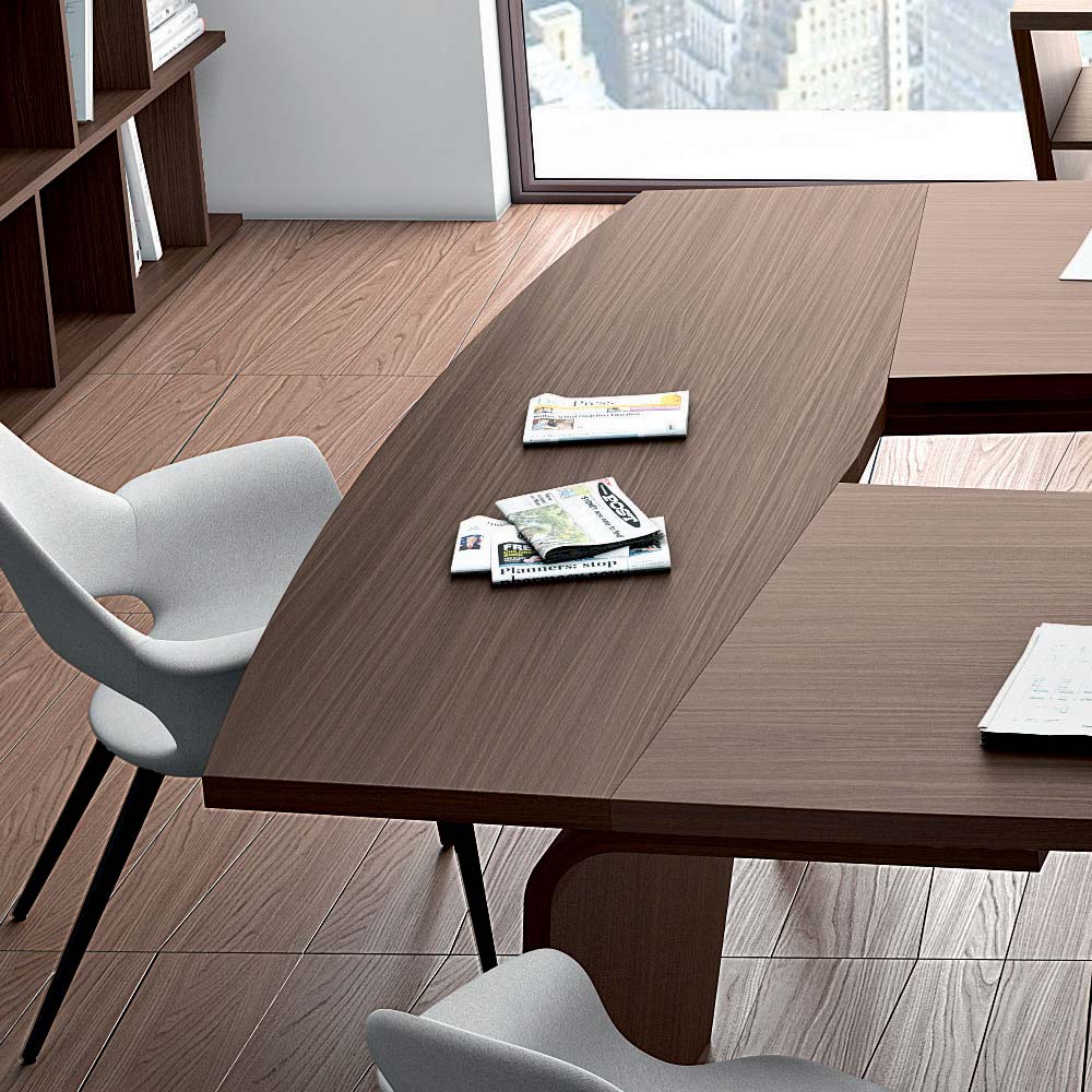 La tapa se compone de dos tapas en forma y dos extensiones que cierran el perímetro de la tapa, creando una mesa de reunión imponente y elegante.