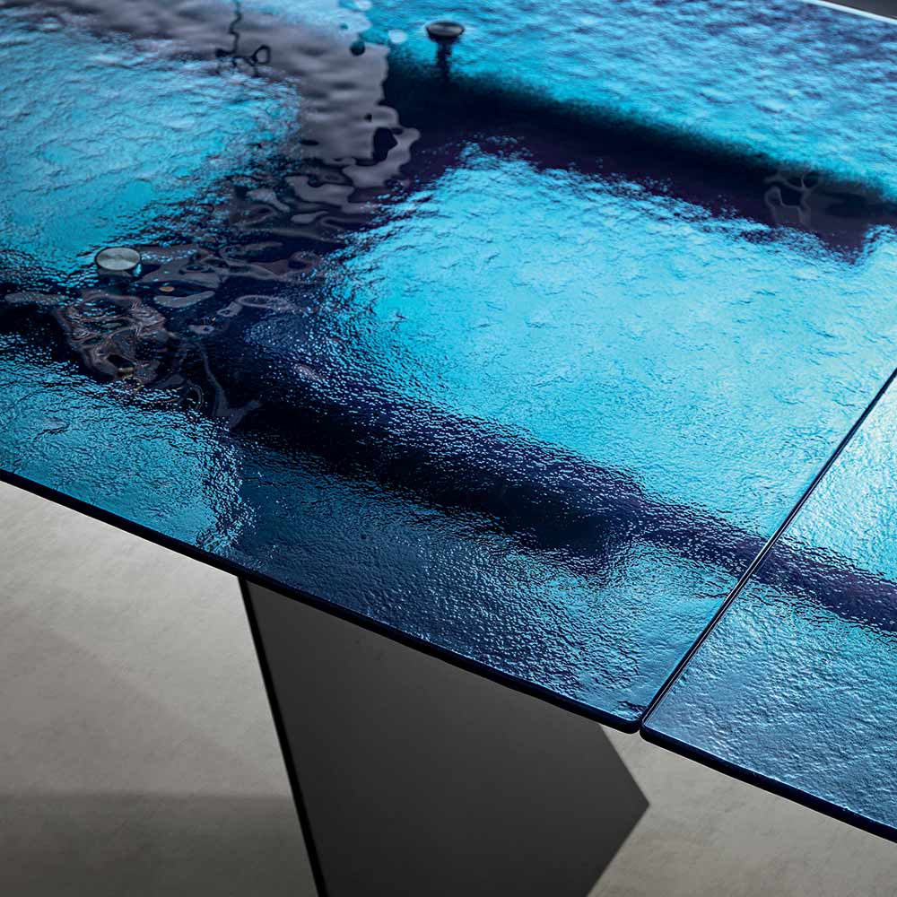 Esta mesa de comedor representa una interpretación innovadora del diseño moderno, combinando materiales de alta calidad con una forma escultural que cautiva la mirada. El tablero, de vidrio martillado , es una verdadera obra de arte: cada detalle de su superficie refleja la luz de una manera única, creando un juego de reflejos y transparencias que aporta profundidad e interés visual al espacio.