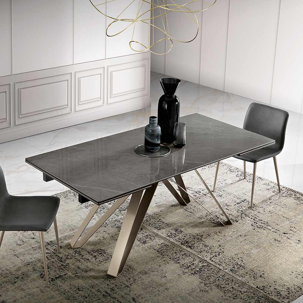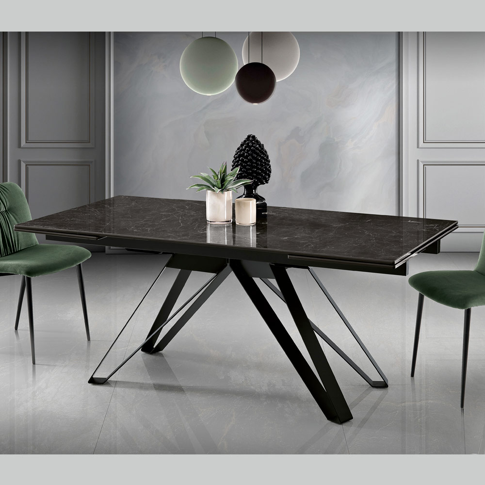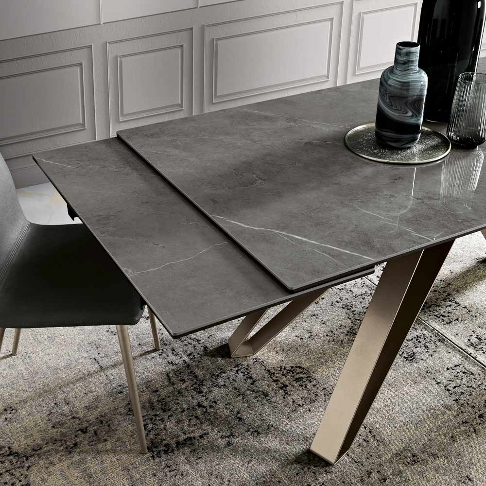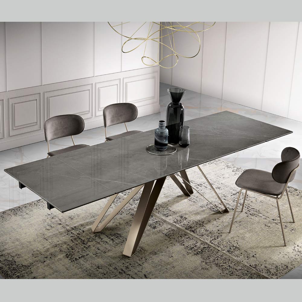 Inmersa en una sofisticada paleta de colores, esta mesa extensible es un ejemplo de elegancia contemporánea. La encimera vitrocerámica es un triunfo estético, un lienzo natural sobre el que se dibujan vetas que aportan profundidad y movimiento a la superficie.
